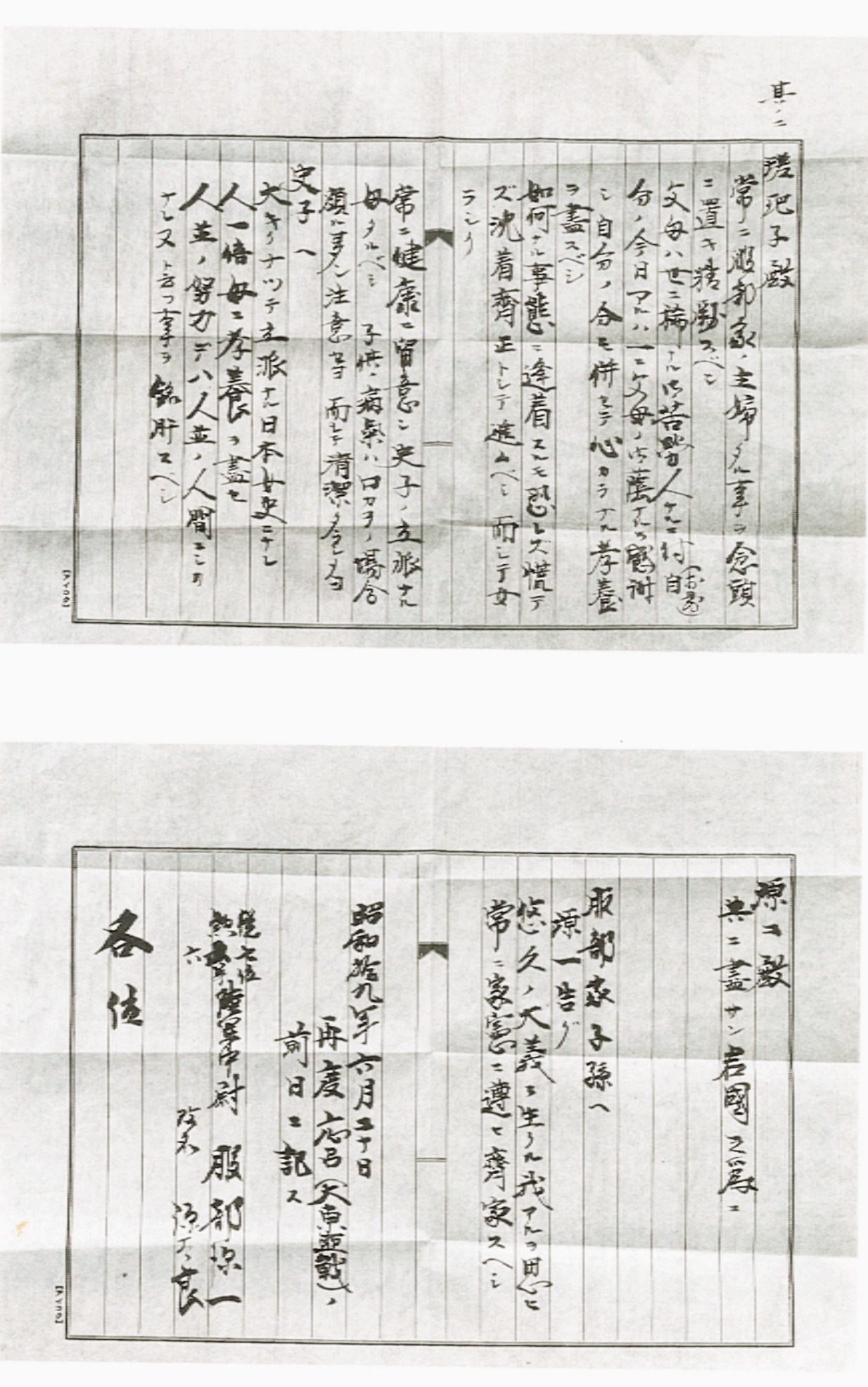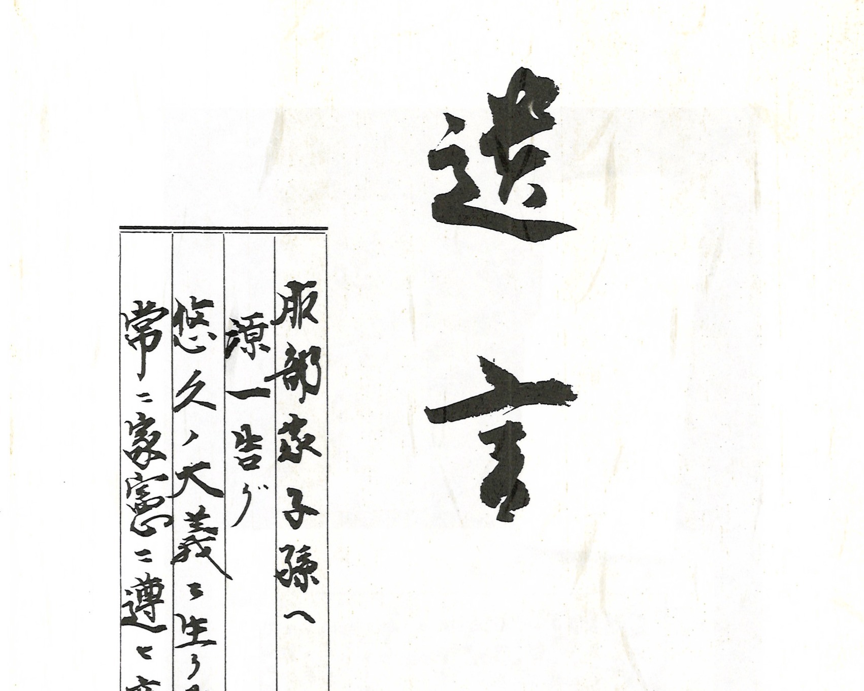 原稿用紙に墨で3枚。父母への感謝、妻と娘への励まし、弟には国への忠誠が説かれていた。そして、「服部家子孫へ」とあり、以下の文言が書かれていた。