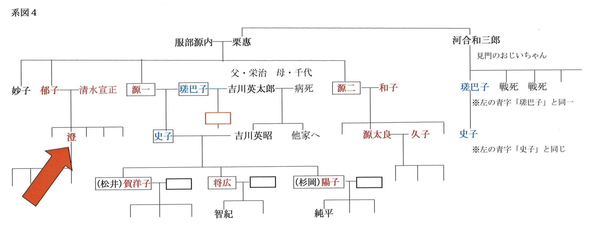 3~4年前には、源一や源二の姉・郁子の子に、史子さんと源太良さんの3人で会った。その人は、史子さんにとっても源太良さんにとってもいとこにあたるのだ。既に亡くなってしまったが、澄(とおる)さんと言い、郁子と清水宣正の子で九品寺の住職だった(系図4参照)。澄さんと源太良さんは親しくて、二人とも会いたいというのでセッティングした。寺で会ったが、その時、史子さんは澄さんの姉の一人とよく遊んだ、と言っていた。澄には4人の姉がいたのだ。ちなみに、連載第27回で賀洋子さんが源一の姉の孫に会った話が出てきたが、澄はその父親にあたる。