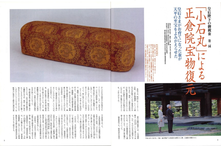 なお、この特集の最後には当時の正倉院事務所所長の三宅久雄氏と、10か年計画に携わってきた正倉院事務所保存課調査室室長の尾形充彦(あつひこ)氏による対談を掲載。正倉院宝物の歴史や小石丸を用いるようになったいきさつ、さらには復元の意義について語っていただいている。