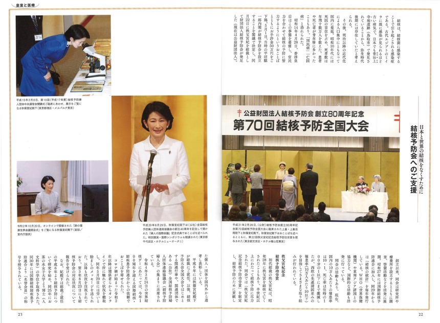平成6年(1994)には秋篠宮皇嗣妃殿下が総裁にご就任。以来、積極的に活動されており、令和4年3月24日の世界結核デーにあたっては、創立100周年を迎える国際結核・肺疾患予防連合からの求めに応じ、おことばを寄せられた。