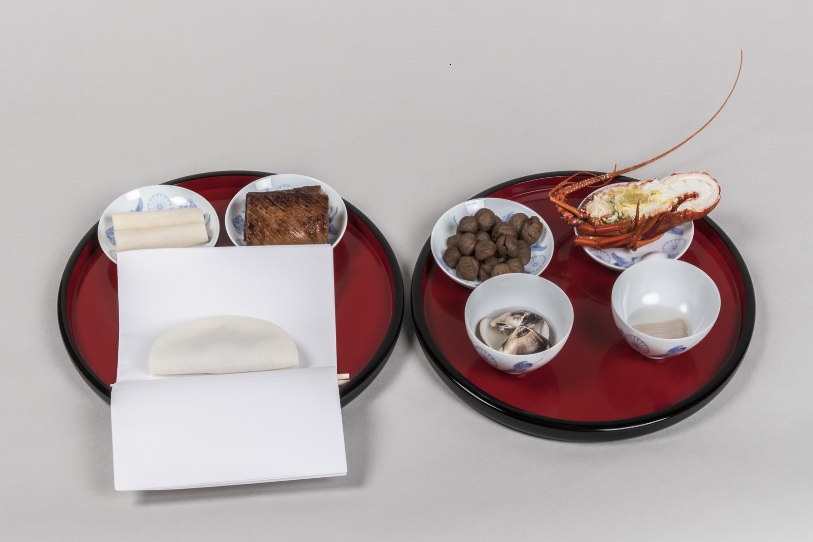 お正月の三が日、両陛下に出されるご朝餐は、宮中の伝統的なお正月のお料理「御祝先付」です。献立は三が日とも同じで、菱葩(ひしはなびら/写真本膳の下)を中心とした本膳に、雉子酒(きじしゅ/写真二の膳の右下)や吸物を配した二の膳と、お福茶がつきます。