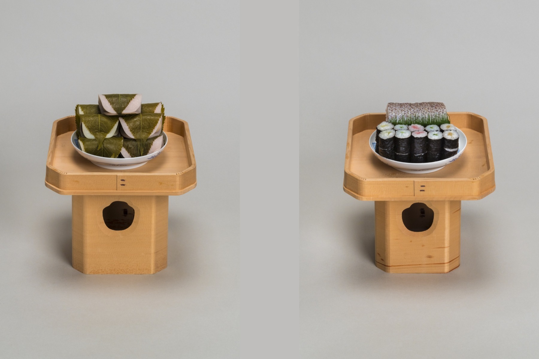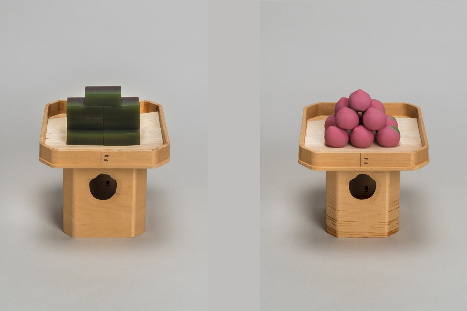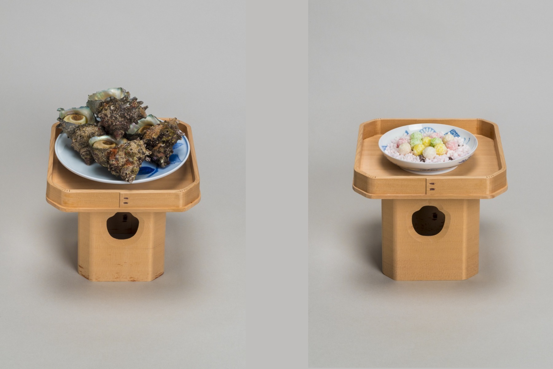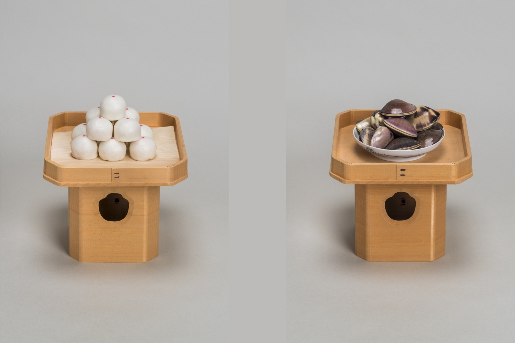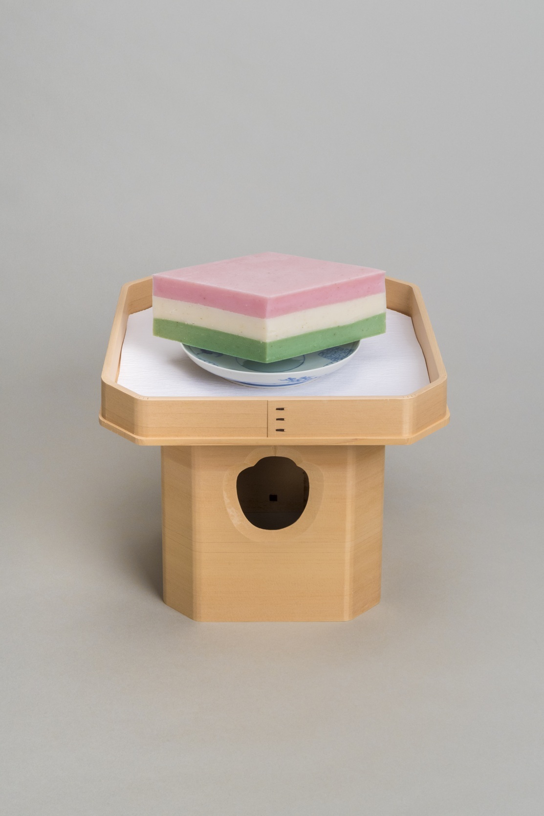 床の間の前には、お供えを載せた三宝(さんぼう)がずらりと並びます。お供えは、お菓子や寿司、貝類などのさまざまなご馳走で、全部で9種類。毎年同じもので、大きな三宝が1つと、小さな三宝が8つあり、大きな三宝には菱餅をお供えします。お菓子と寿司はすべて大膳課でつくられ、盛り付け方も決まっています。