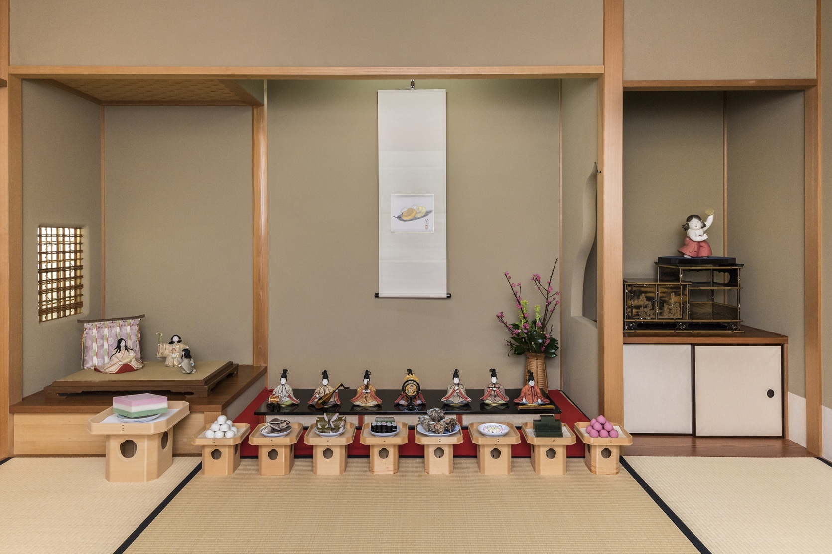 写真の桃の節句のお和室のしつらいでは、床の間に蛤の図柄の軸が掛けられ、楽人の人形や、桃の花と菜の花が飾られ、左右には雛人形と御所人形が飾られています。お飾りになる軸や人形は、年によって変わります。