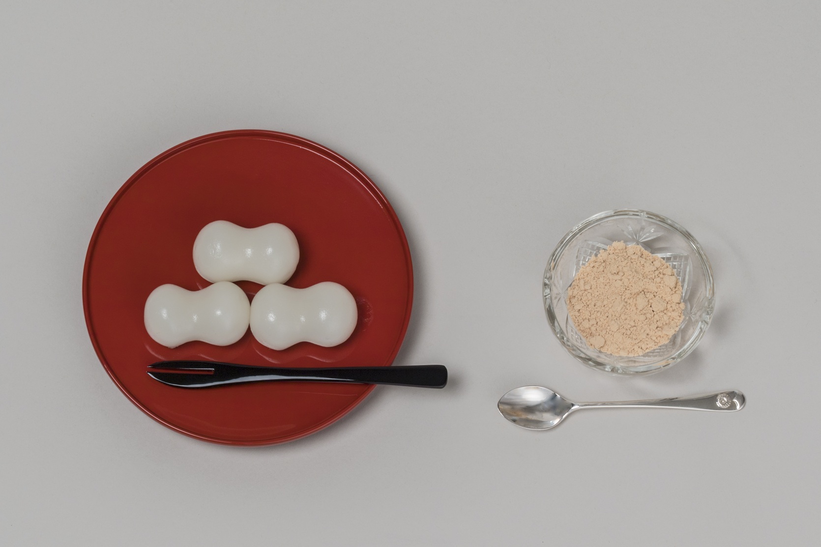 繭団子は、天皇陛下が皇居内の水田で栽培された御親裁米(ごしんさいまい)を用いて作られます。三宝(さんぼう)に和紙を敷いた上に、繭団子をきれいに積み上げてお供えします。その日のお召上がり用には、繭団子に黄粉(きなこ)が添えられます。