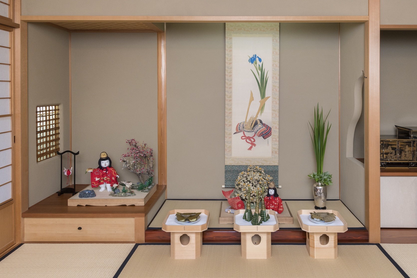 写真のお和室の端午の節句のしつらいでは、床の間に兜(かぶと)に菖蒲の図柄の軸が掛けられ、菖蒲の葉と蓬(よもぎ)、めでたい鯛引の御台(おだい)人形と紅白梅鶴亀の御台人形が飾られています。御台人形は、木製の台の上に御所人形や草花・動物などの作り物をのせ、能の舞台や吉祥物などを表現した人形のこと。お飾りになる人形や軸は、年によって変わります。