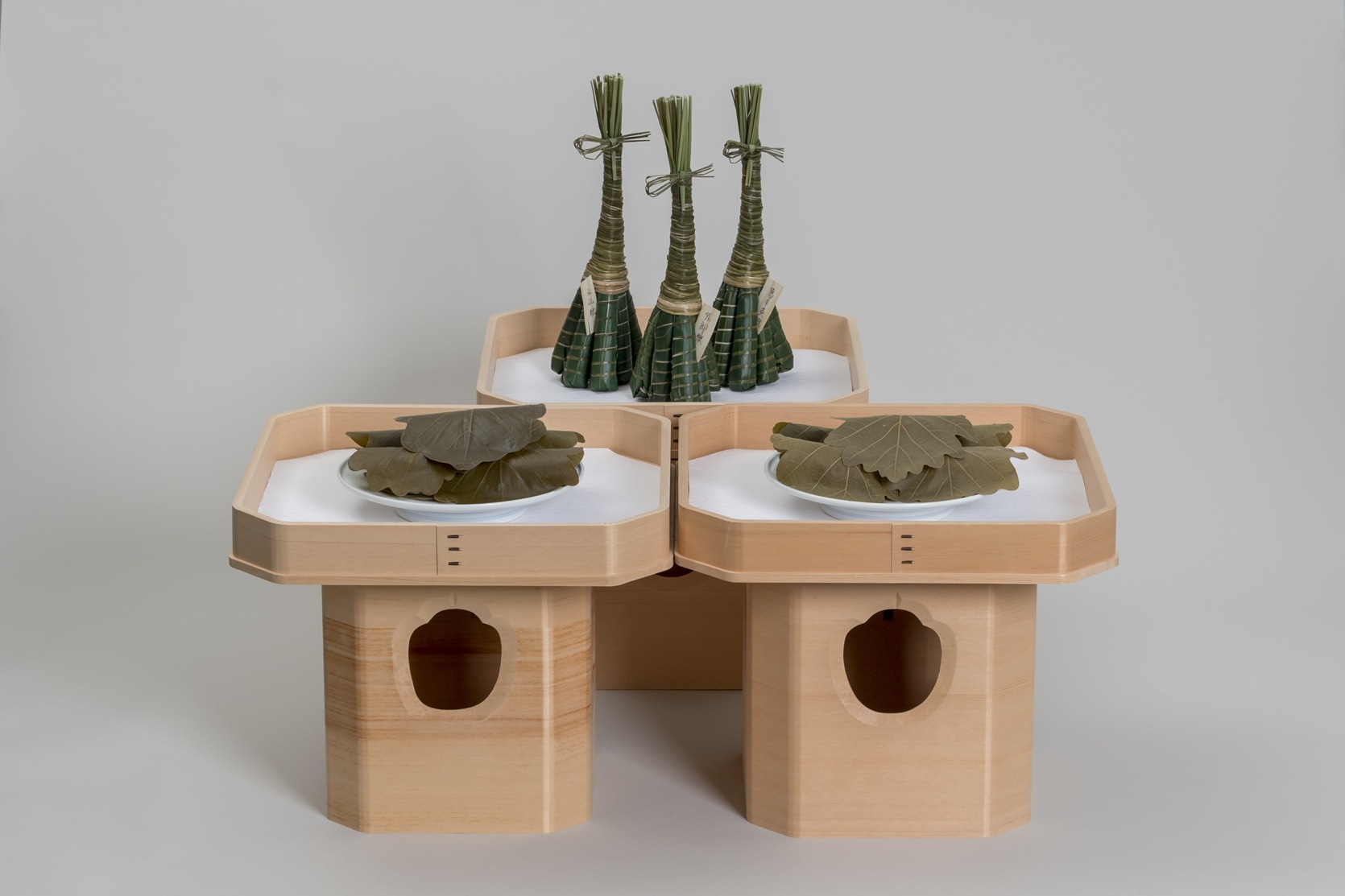 その前に並ぶ3つの三宝(さんぼう)には、粽(ちまき)と柏餅が飾られます。右の三宝には柏餅餡、左の三宝には柏餅味噌餡、中央の三宝には葛羊羹(くずようかん)粽(右)、外郎(ういろう)粽(中)、水仙粽(左)をお供えします。こられはすべて大膳課でつくられます。