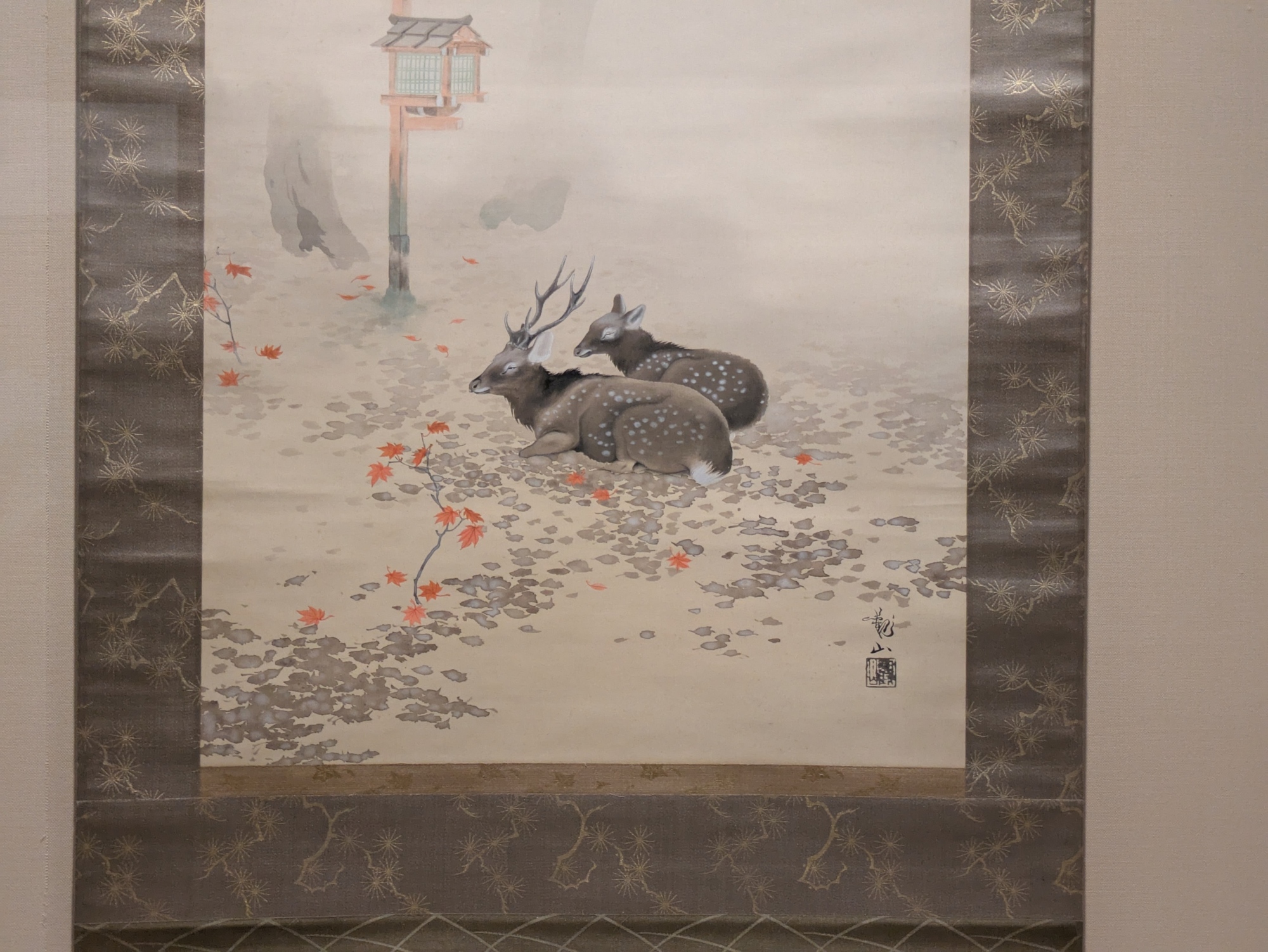 こちらも秋らしい画題。奈良・春日大社の境内の光景が描かれています。朝まだき、眠たげな鹿の図。
