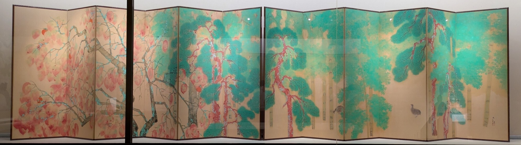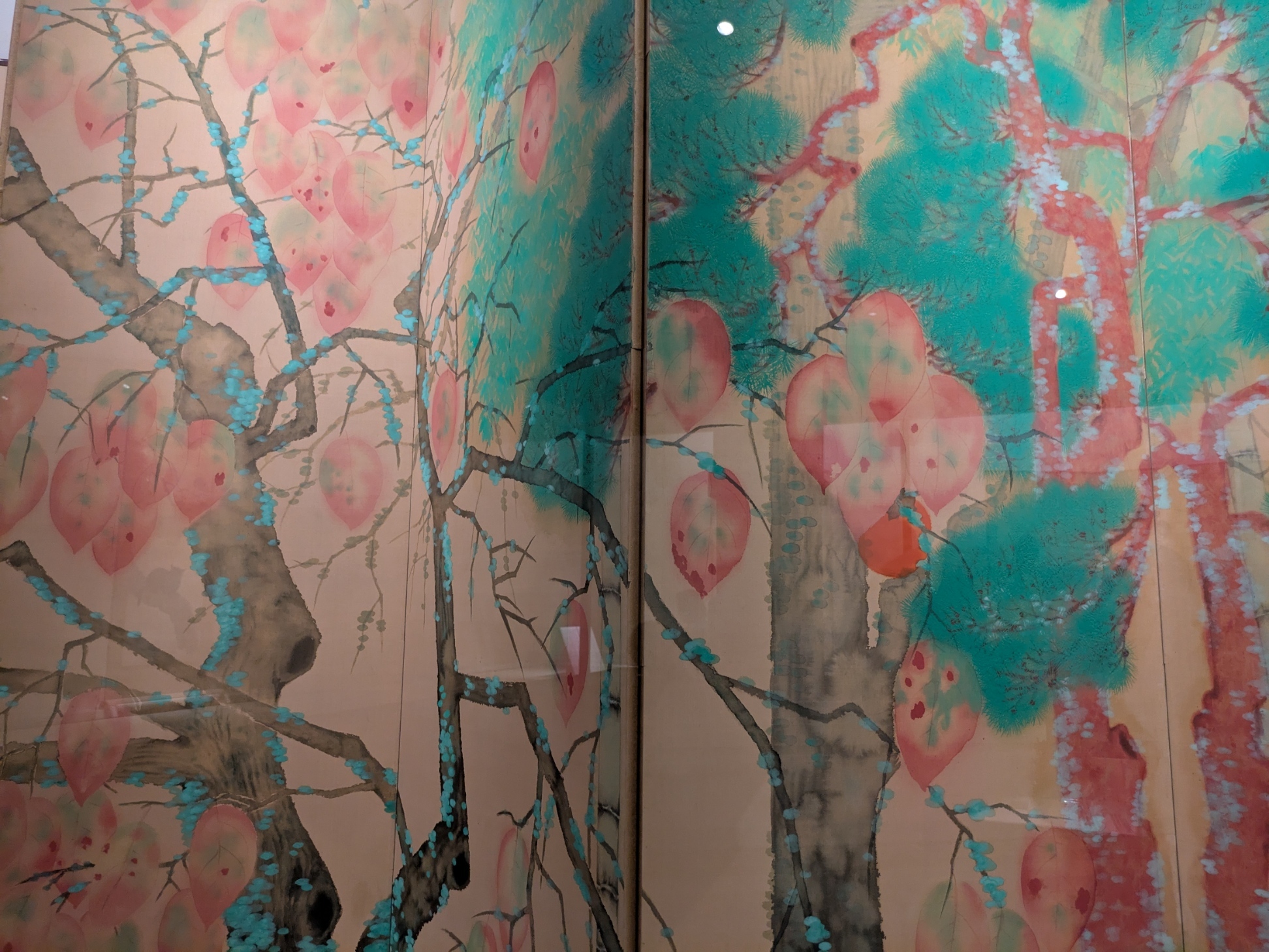 近づいて見ると、葉や幹に「たらし込み」と呼ばれるぼかしの技法が用いられているのがよくわかります。