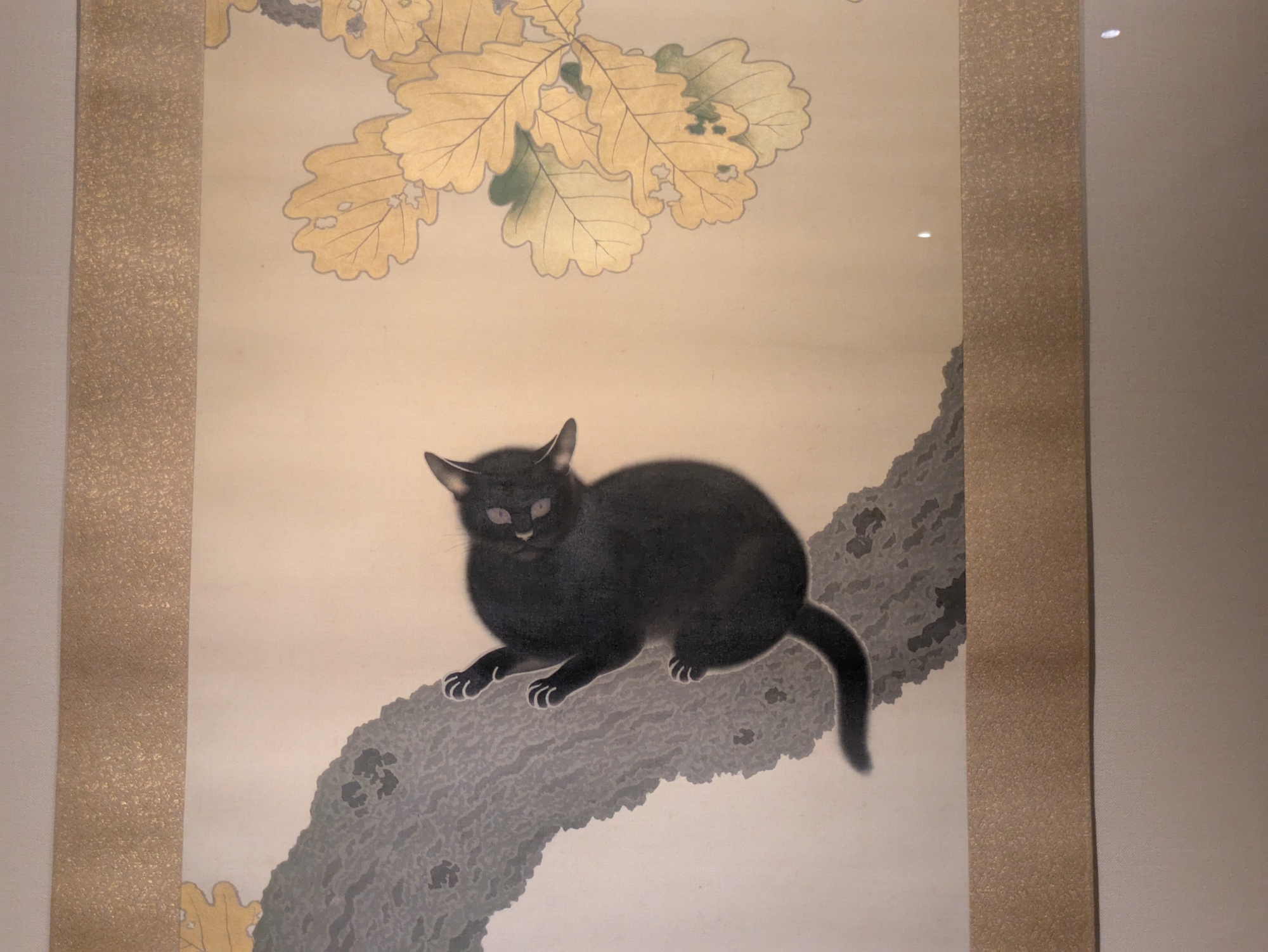 4階の展示室の奥に、いました! あの黒猫が。遠くから見ても存在感がありますが、近づいて見ると、漆のようにマットな黒なのに、空気を含んだようなフワフワの毛並み。この猫は、墨の巧みなぼかしで描かれています。金泥(きんでい)と緑青(ろくしょう)で描かれた柏の葉との取り合わせの妙に、画家のセンスを感じます。