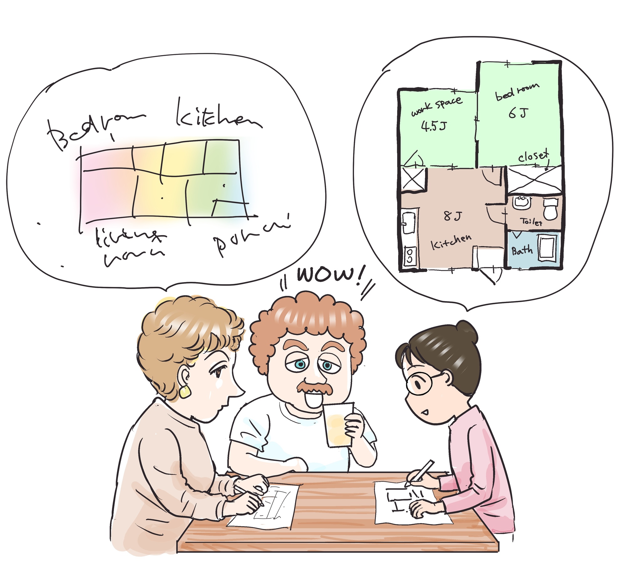 ほかの海外の友人に聞いてみても、だれも間取り図を描いたことがないということにまず仰天! 無理して描いてもらったとしても、大きさの基準がないせいか、妙に縦長の部屋とか、ほぼ丸でしかない区分けとか、間取り図という概念にそぐわないものが出てきたのです。
