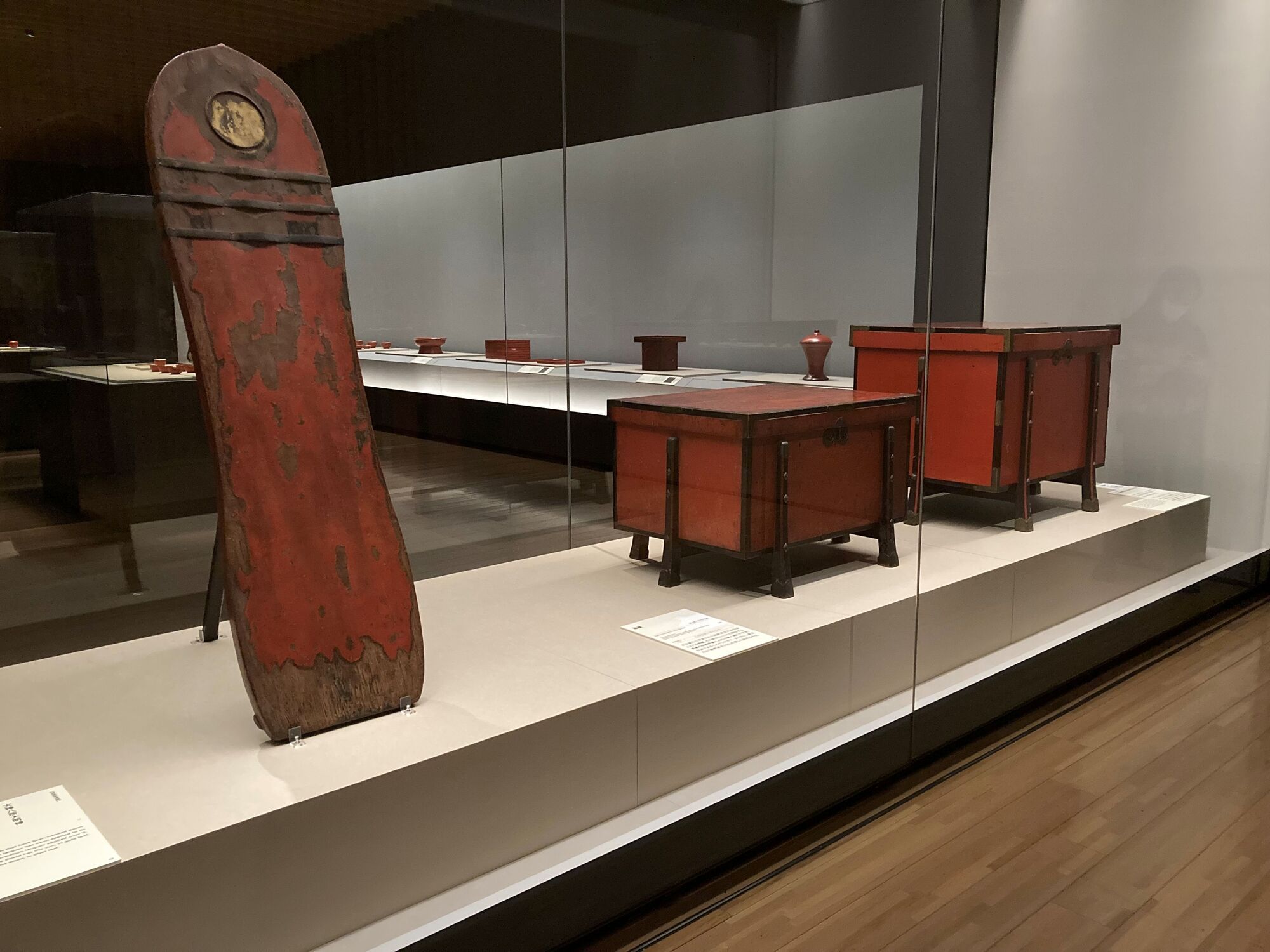 この第一章では、和歌山・熊野速玉(はやたま)大社所蔵の国宝「唐櫃(からびつ)」(熊野速玉大社古神宝類のうち)と、奈良・大神(おおみわ)神社所蔵の重要文化財「楯(たて)」も展示されています。