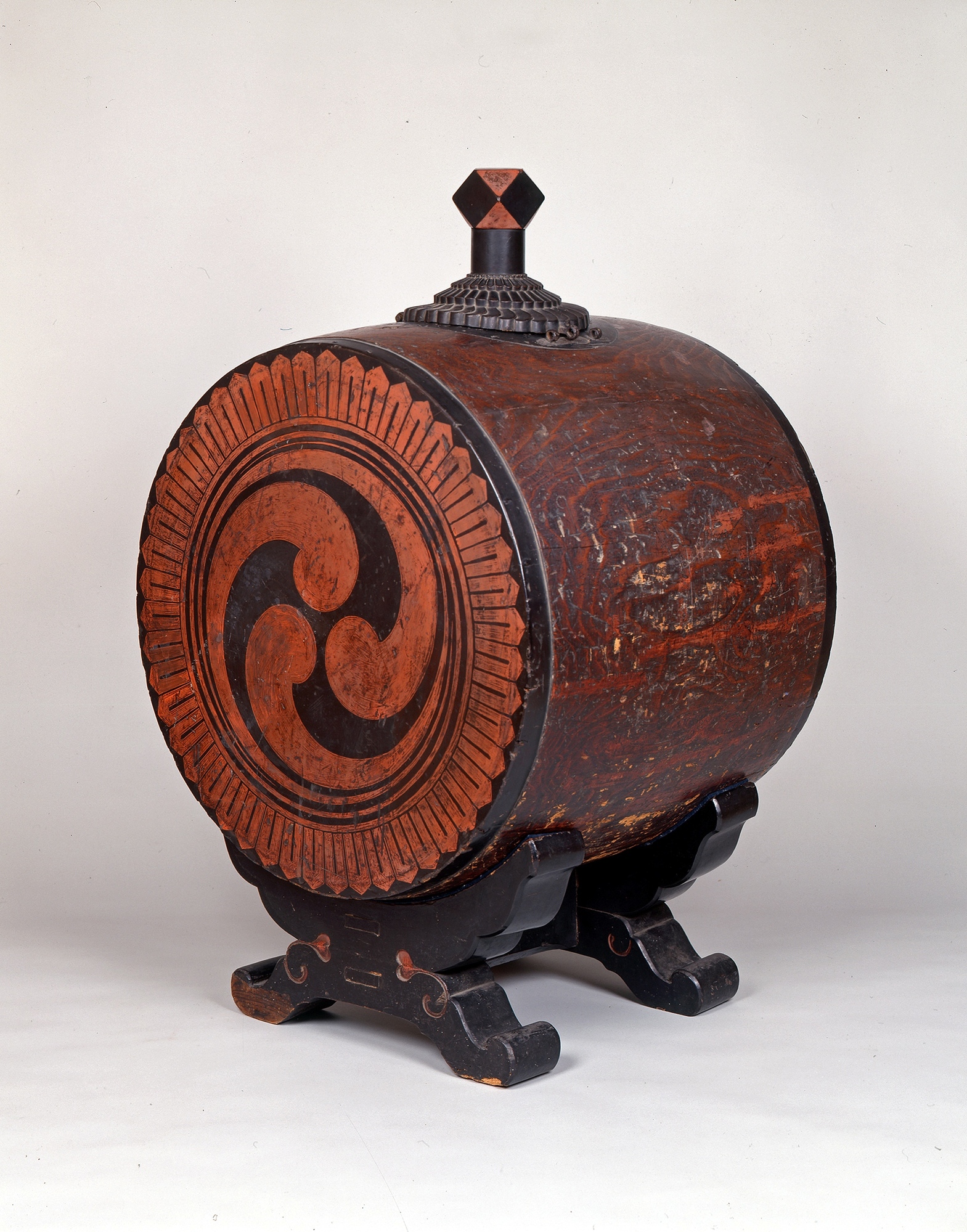 この太鼓樽は室町時代の文明5年(1473)、高野山の地主神である丹生都比売大神(にうつひめのおおかみ)に、常備の酒器として捧げられたもの。「丹」は朱を意味することから、朱漆塗り酒器はまさに丹生都比売大神にふさわしい品といえます。