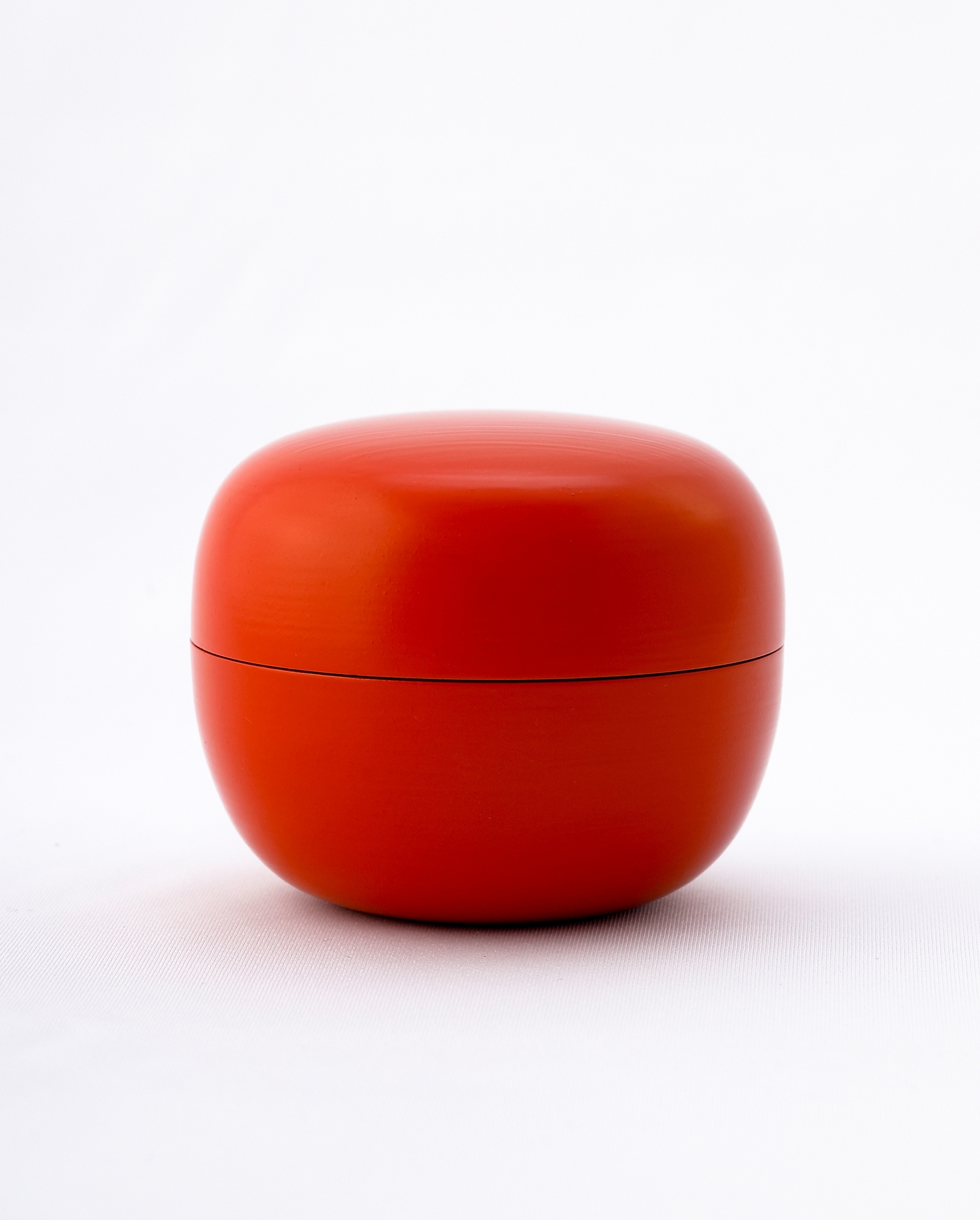 こちらは京都・鍵善良房(かぎぜんよしふさ)所蔵、黒田辰秋(たつあき)の制作による「根来塗平棗(ひらなつめ)」です。黒田辰秋(明治37年~昭和57年)は京都出身の漆芸家、木工家で、昭和45年に人間国宝に認定されています。棗は茶道において抹茶を入れておく容器で、平棗はその名の通り平らな形状が特徴です。この平棗には刷毛で漆を塗った後などがまったく見当たらず、そのつややかさに驚かされます。