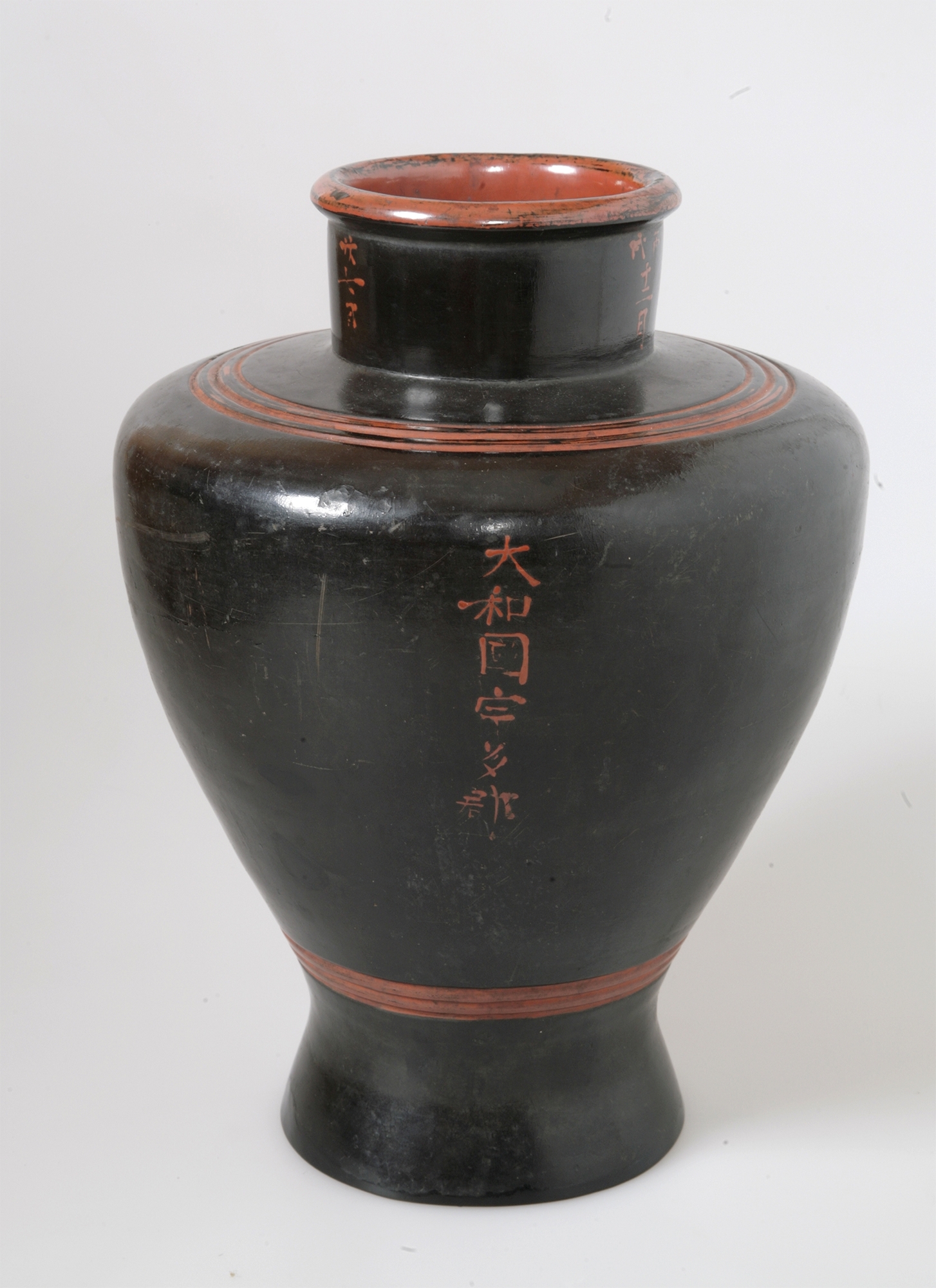 同じコーナーには重要文化財の黒漆の瓶子も展示されていました。こちらは二口一対で、奈良の惣社水分(そうしゃみくまり)神社所蔵の品です。胴部に朱漆で銘があることから、貞和2年(1346)の制作であることや、制作当初から惣社水分神社に伝来していたことが判明しています。黒漆のどっしりとした重厚なたたずまいが、見る者を厳粛な気持ちにさせます。