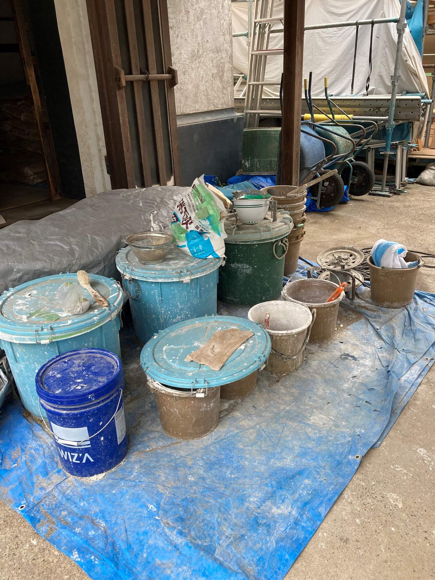 「左官の仕事は一人でじっくり取り組めるものもあれば、塗った漆喰が乾く前に作業を終わらせなくてはいけない時間勝負のものもあって、作業工程によって必要な人数が変わるんですね。今日は、あじま左官工芸から独立した2人のベテランと、今、僕が連れて歩いて教えている今井謙真(けんしん)が入っています。今井は左官になって4年目ですね。今回の現場は蔵なので、蔵に慣れた人たちに来てもらうようにしています」