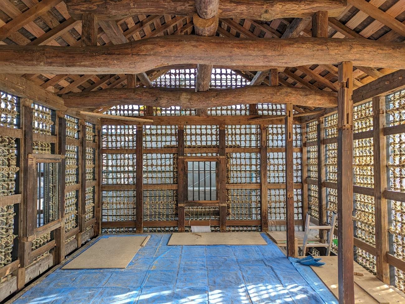 私が、この長谷さんの言葉を聞いて思い出したのは、先の動画です。左官が現場に入るのは、大工が基礎部分や柱、天井などの構造を組み直した後です。動画を見ると、左官が壁を造るまで、蔵は柱と天井があるだけ。柱と柱の間には板のような、下地となるようなものが何もなく、風が吹きわたる骨組みの状態でした。言ってみれば、蔵の壁は無の状態から左官が作っていたのです。