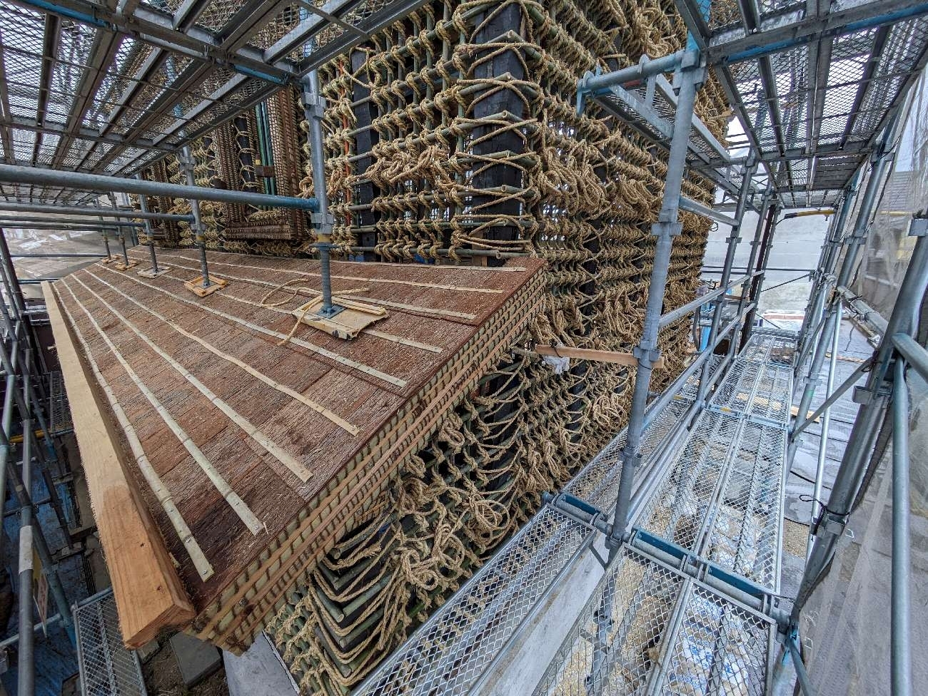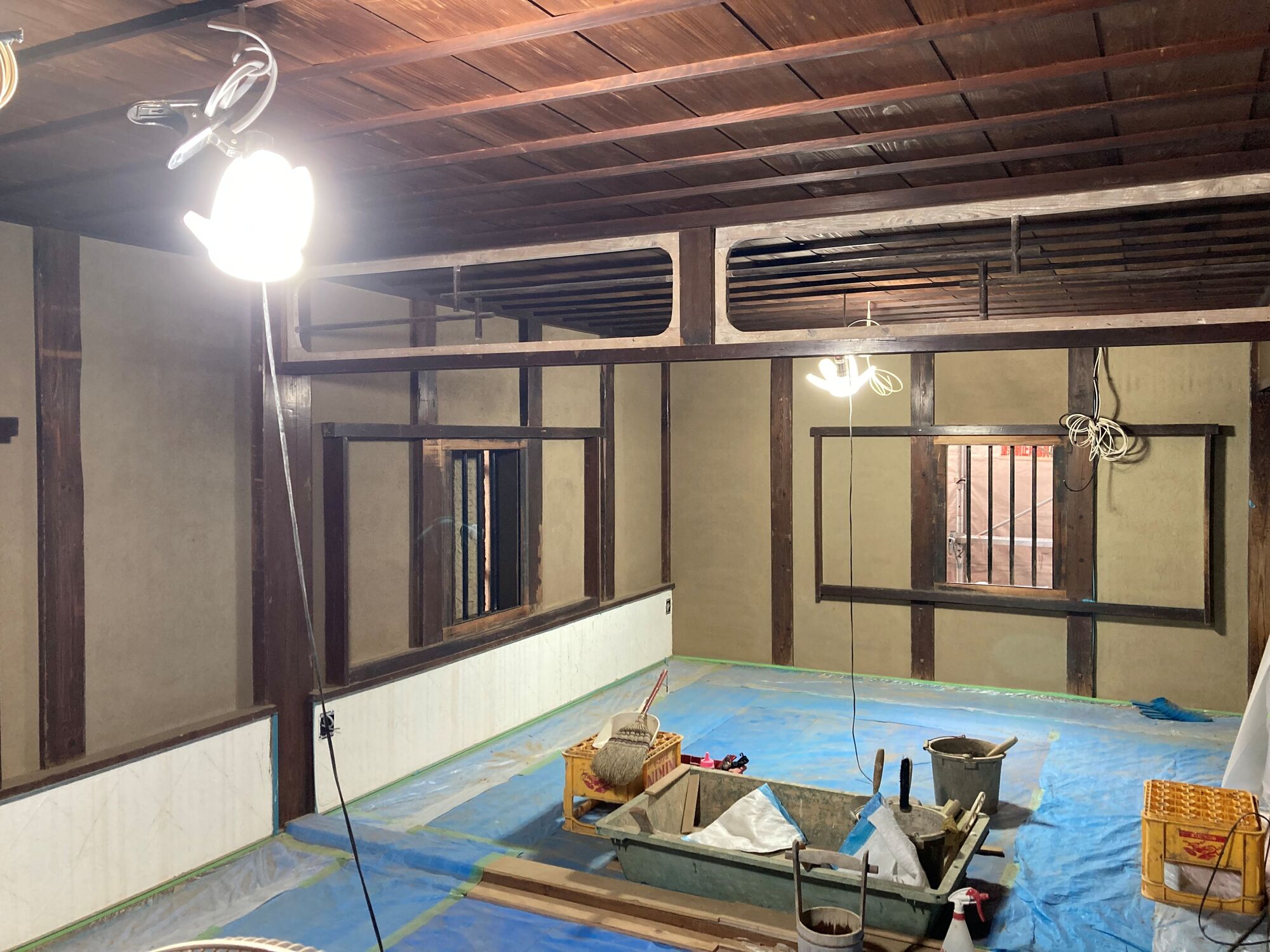 この耐震化工事は建物を一度すべて解体して、再び組み直す「根本修理」です。私が訪れた日は、大工さんによる解体・組み直しは既に終了し、長谷さんを含めて4人の左官が作業をしていました。左官の作業は令和5年8月から始まったそうです。