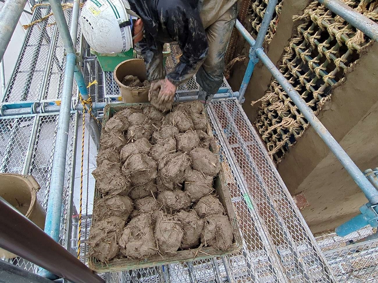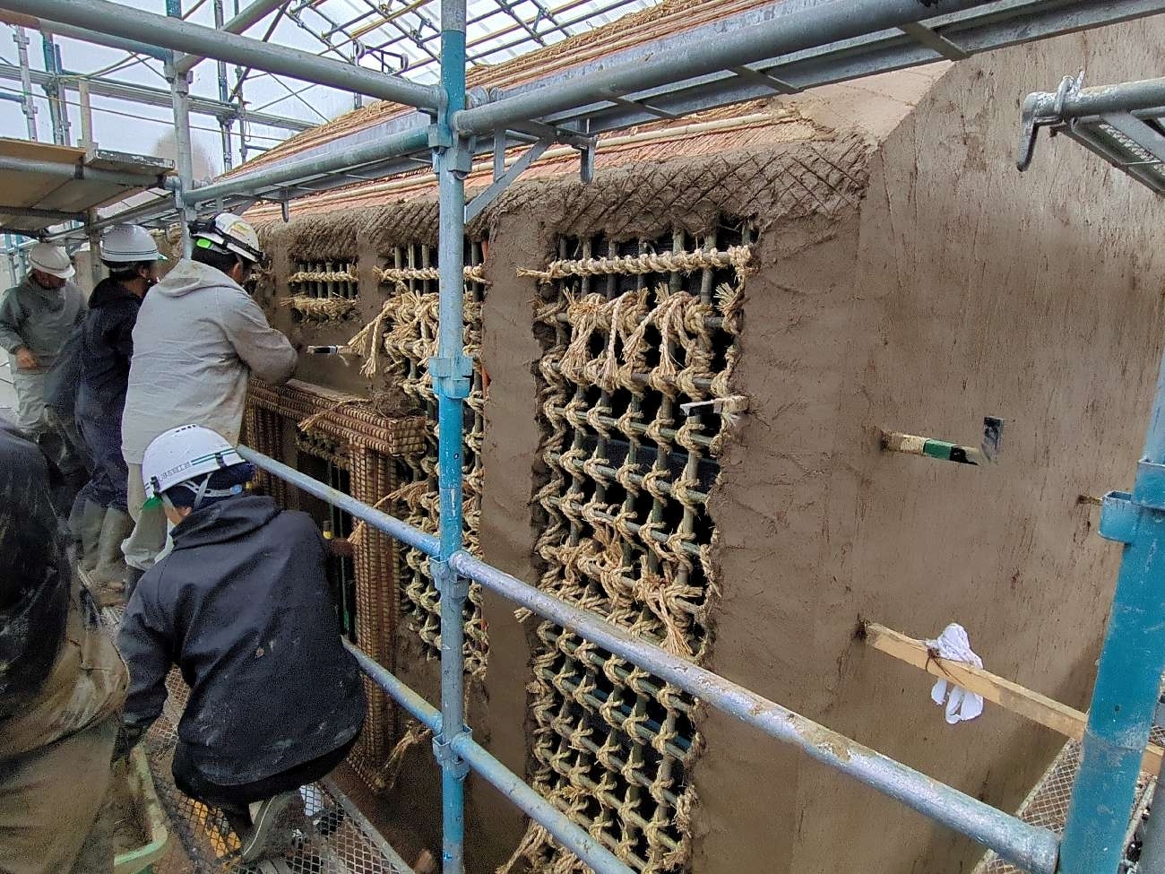 次に竹小舞に泥団子を打ち付ける「荒打ち」を1~2か月かけて行い、「荒壁」を作っていきます。動画にも収められていましたが、大勢の左官が藁スサ混じりの大きな泥団子を次から次へと竹小舞に打ち付けて均していく様子は、なんだか楽しそうでした。ちなみにこの荒打ちは、日によってメンバーは違いますが、連日約10人の左官で作業したそうです。