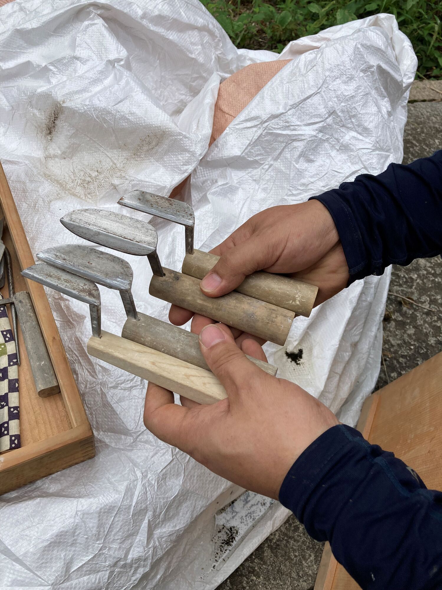 長谷さんがいろいろな鏝の入ったケースを持ってきてくれました。形や大きさもさまざまですが、素材も違うようです。