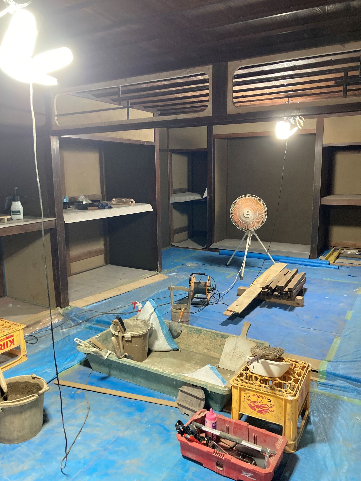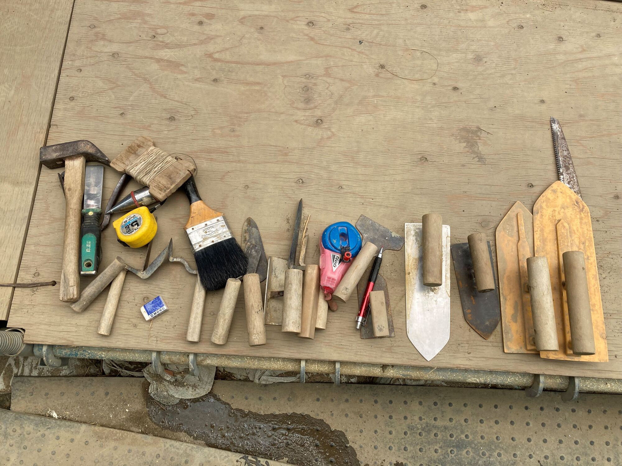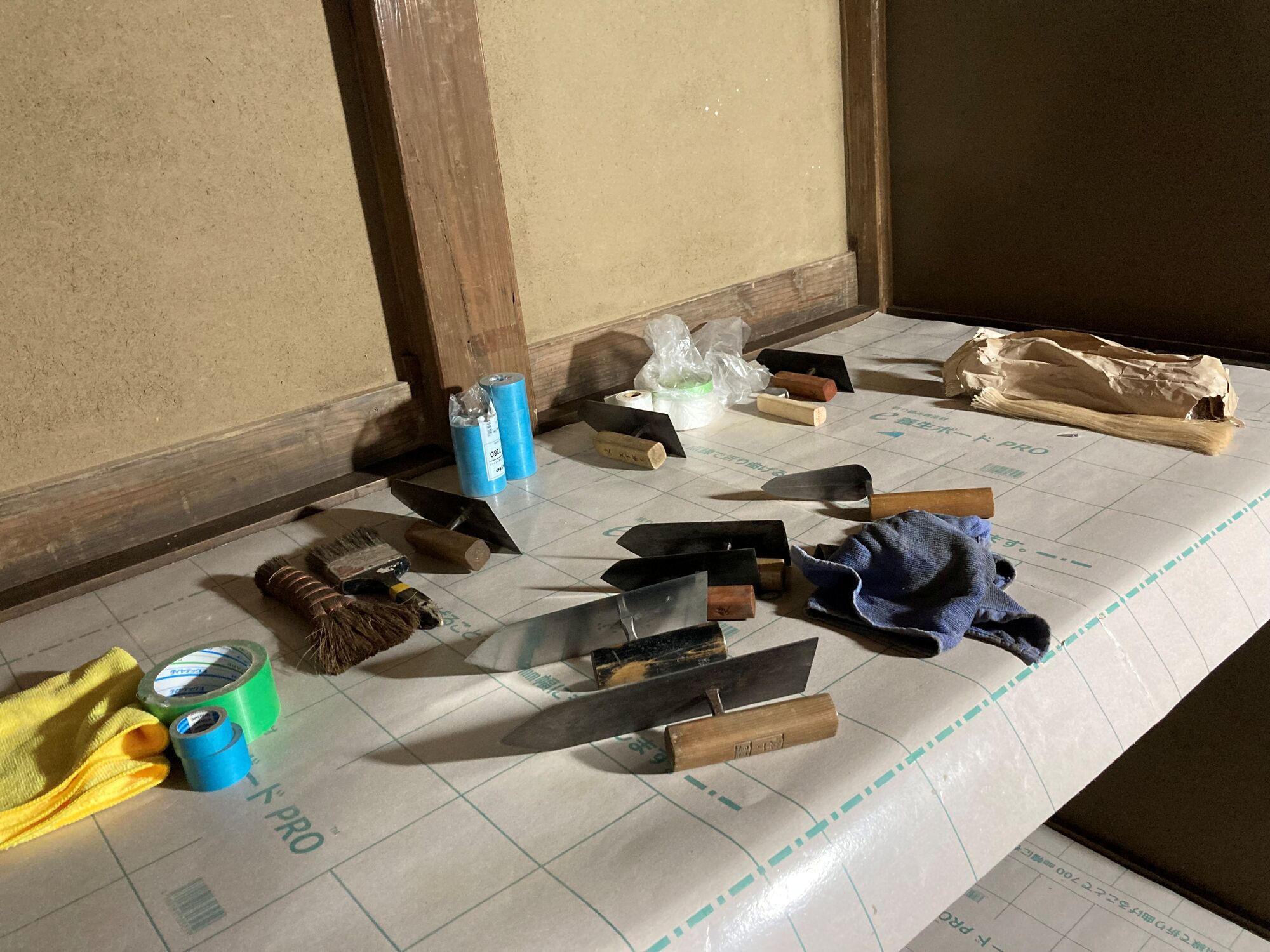 鏝―左官に欠かせない道具の話扉の作業を見せてもらった後、2階へと上がりました。2階も内部は柱の見えている真壁で、この時は斑直しを終え、中塗りの真っ最中でした。中塗りを終えると残るは漆喰で仕上げるだけなので、壁のほぼ最終段階を迎えているというわけです。あちらこちらにいろいろな道具が置かれています。