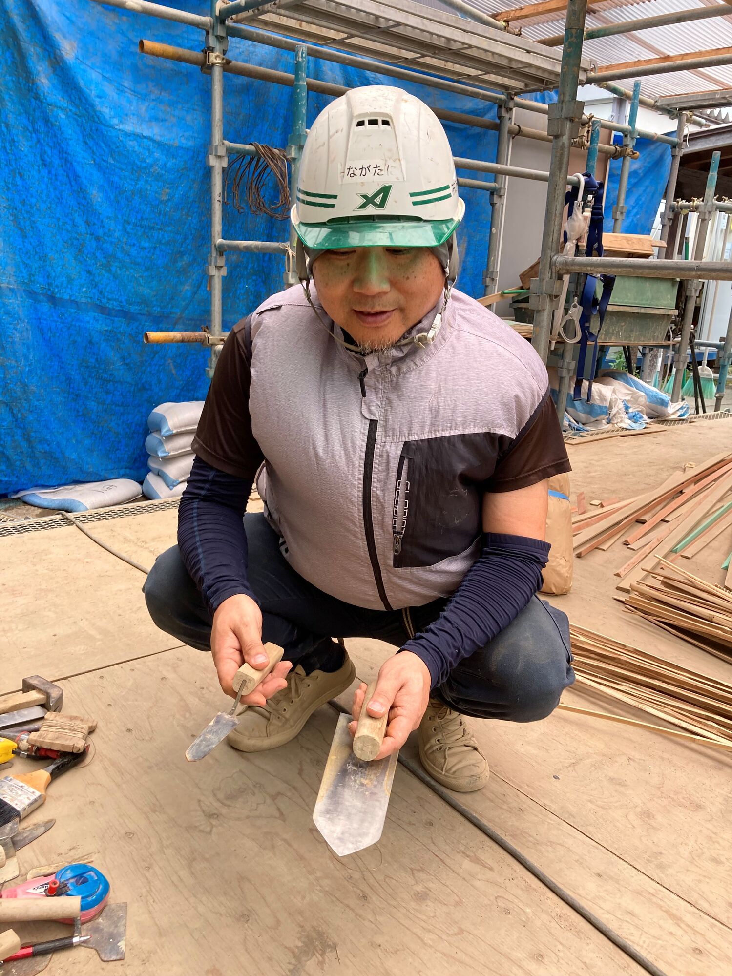 ちなみに本焼きとは最も硬い鏝で、セメントや石膏を扱うのに向いているそうです。逆に地金は柔らかい鏝で土や漆喰に向いているとか。またステンレスの鏝は「硬くてつるつる」なので、土やモルタルを塗るときは滑って塗りにくいけれど、最後の仕上げに用いるときれいな仕上がりになるそうです。下の写真で長谷さんが手にしているのは「面引き(めんひき)」という鏝で、角を作る時に引く(作業する)鏝だそうです。