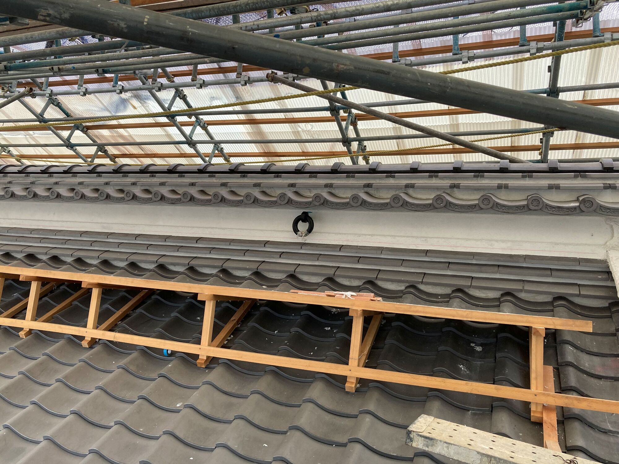 屋根を見上げると、3人の職人がそれぞれの作業をしているのが見えました。近くで見るため、ヘルメットを被り、素屋根の階段を屋根まで上りました。近くまでくると、ベテランの1人が足場の上で立ち、鬼瓦の方に腕を伸ばして作業をしています。