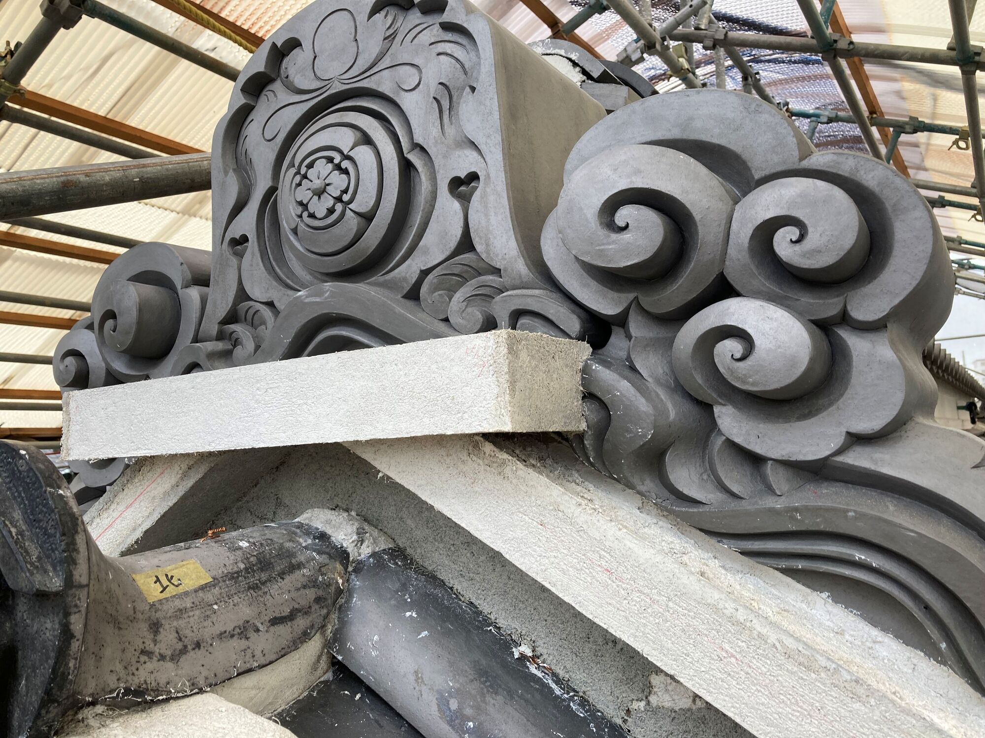 「鬼台は鬼瓦を固定させる土台です。鬼瓦は屋根の端の勾配のある所に据えられるため、その下に台が必要になるわけです。鬼台の基になるものはありませんので、左官が砂漆喰を使って、無から有を作り出しています」