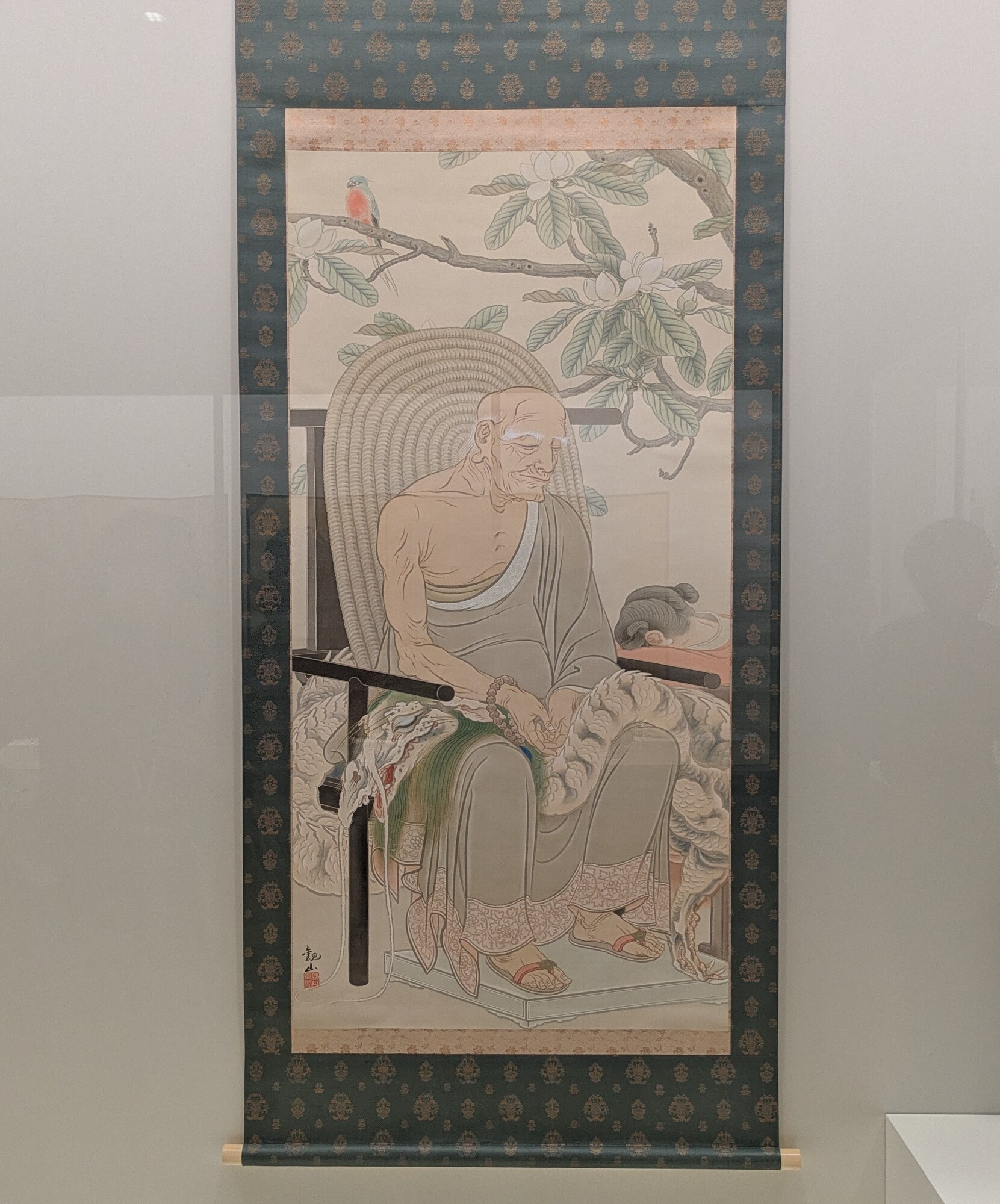昼下がりでしょうか。タイサンボクが白い花を咲かせる梢の下、椅子に腰かけて眠る羅漢(らかん)。その奥では童子がつっぷして眠りこけ、羅漢の頭上の枝では小禽(しょうきん)がじっと目を閉じ眠っています。羅漢の膝の上に、ぐったりと力の抜けた体を預けて眠るのは、龍。ということは、この絵は羅漢の夢の中の様子を描いているのかもしれません。じつに気持ちよさそうな四者の眠りっぷりに、こちらまで眠気を誘われるような《四眠》と題された作品。画題は、豊干禅師(ぶかんぜんじ)、寒山(かんざん)、拾得(じっとく)、虎を描く中国画の「四睡図(しすいず)」の系譜ですが、観山はまったく異なる四者に置き換えて描いています。