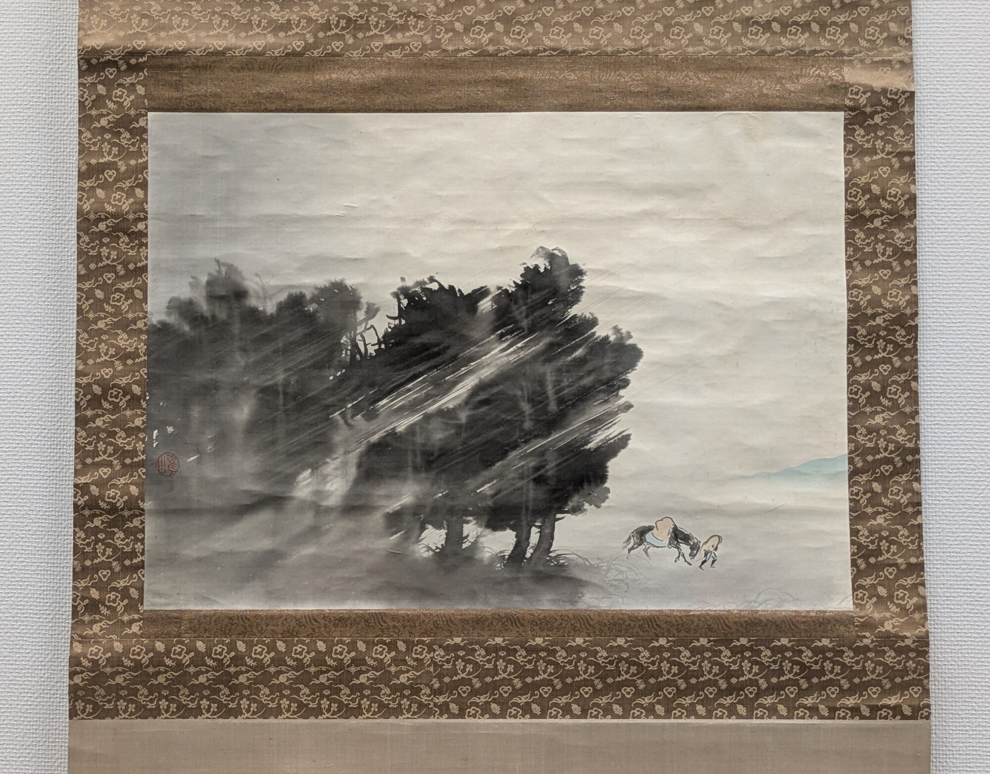 展覧会には、留学当時制作され、大英博物館に所蔵される観山の作品から5点が里帰りしています。その中の《雨中行旅図》は、水墨画に水彩画を取り入れたような、不思議な雰囲気が漂います。