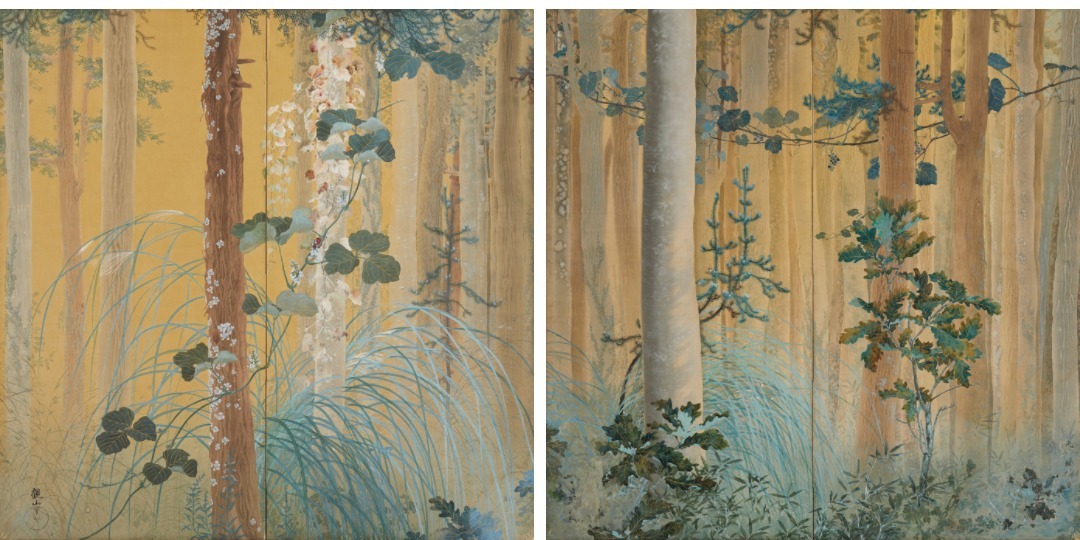 イギリス留学の成果を示す新たな表現に挑んだ第一作が、こちら。第1回文部省美術展覧会に出品され、高い評価を得た《木の間の秋》です。金泥(きんでい)を背景に、木立に下草やツタが茂るさまを描いたこの作品には、西洋画の写生的な表現と琳派風の装飾性の両方が見てとれます。派手な花などはないのに目の覚めるように美しく、木立の中に入り込んでしまうように感じます。