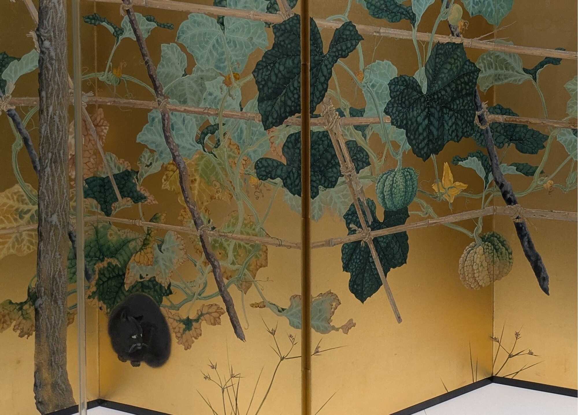 金地を背景に、支柱にからまるカボチャと、うずくまる黒猫を描いた屏風。こちらは左隻で、右隻には飛び立つカラスが描かれています。前述の《木の間の秋》では金色に秋らしい光を感じましたが、観山の談によれば、この作品では金色は照りつける夏の太陽の光を表しているそう。卓抜した筆技でカボチャの実や葉、猫の体毛、支柱など異なるテクスチャーが緻密に描き分けられています。生命力旺盛なカボチャと、その葉陰に身を潜める猫が、背景の金色に負けることなく、鮮やかに浮かび上がります。