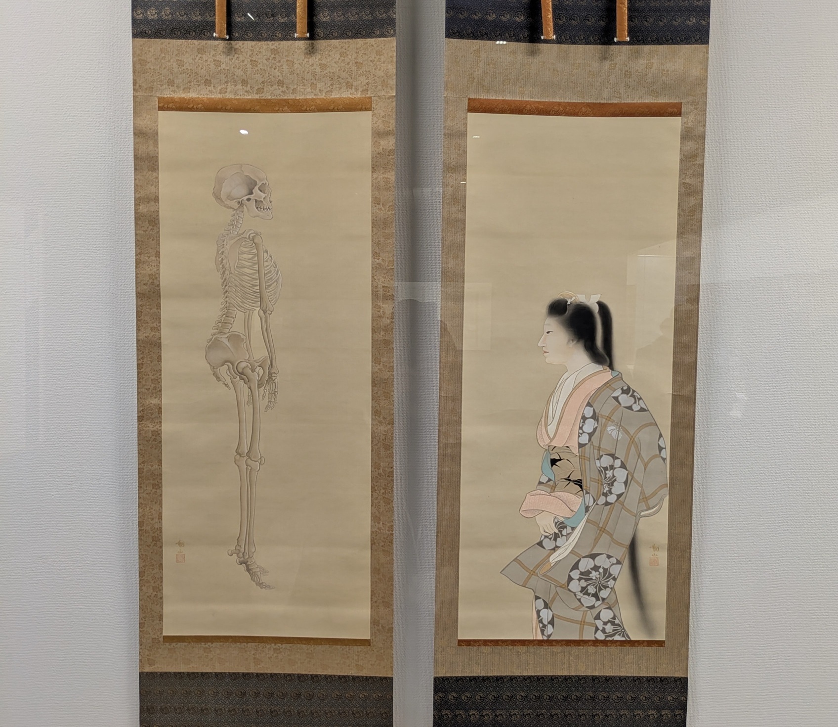 左に骸骨、右に女性を向かい合わせで描いた、左右一対の掛け軸。ドキリとしてしまう画題ですが、西洋では「メメント・モリ(死を思え)」の概念を表すモチーフとして髑髏が描かれ、日本では古くから死体が朽ちる様子を表す「九相図(くそうず)」が描かれてきました。「美女も死んでしまえばみな同じ」といったメッセージを見たり、解剖学的な要素を見たりと、さまざまな見方ができそうな作品です。