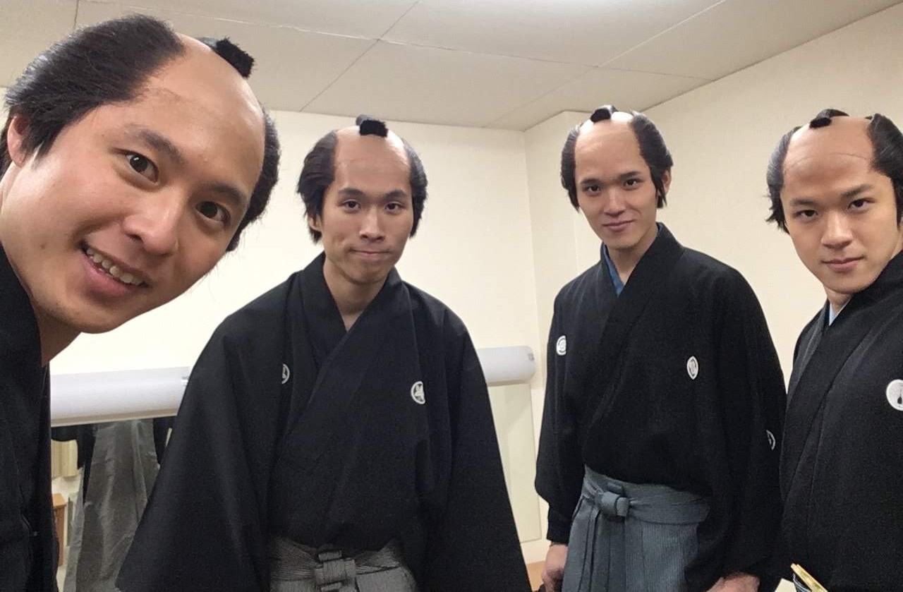 それぞれの楽屋では、能楽師たちが真剣な表情で身支度を始めている。大勢の知らないおじさんたちが「紋付(もんつき)の着物に袴」という同じコスチュームに着替えているのを前にして、頭の中で「このお人にはさっき挨拶しただろうか?」という問いがぐるぐる回る。僕の存在に気づいたおじさんたちは、心中で「どこの子?」「え、なんで坊主頭?」と思っていることだろう。なんせ先週までの僕は、丸刈りが伝統の空手部員だったのだ。