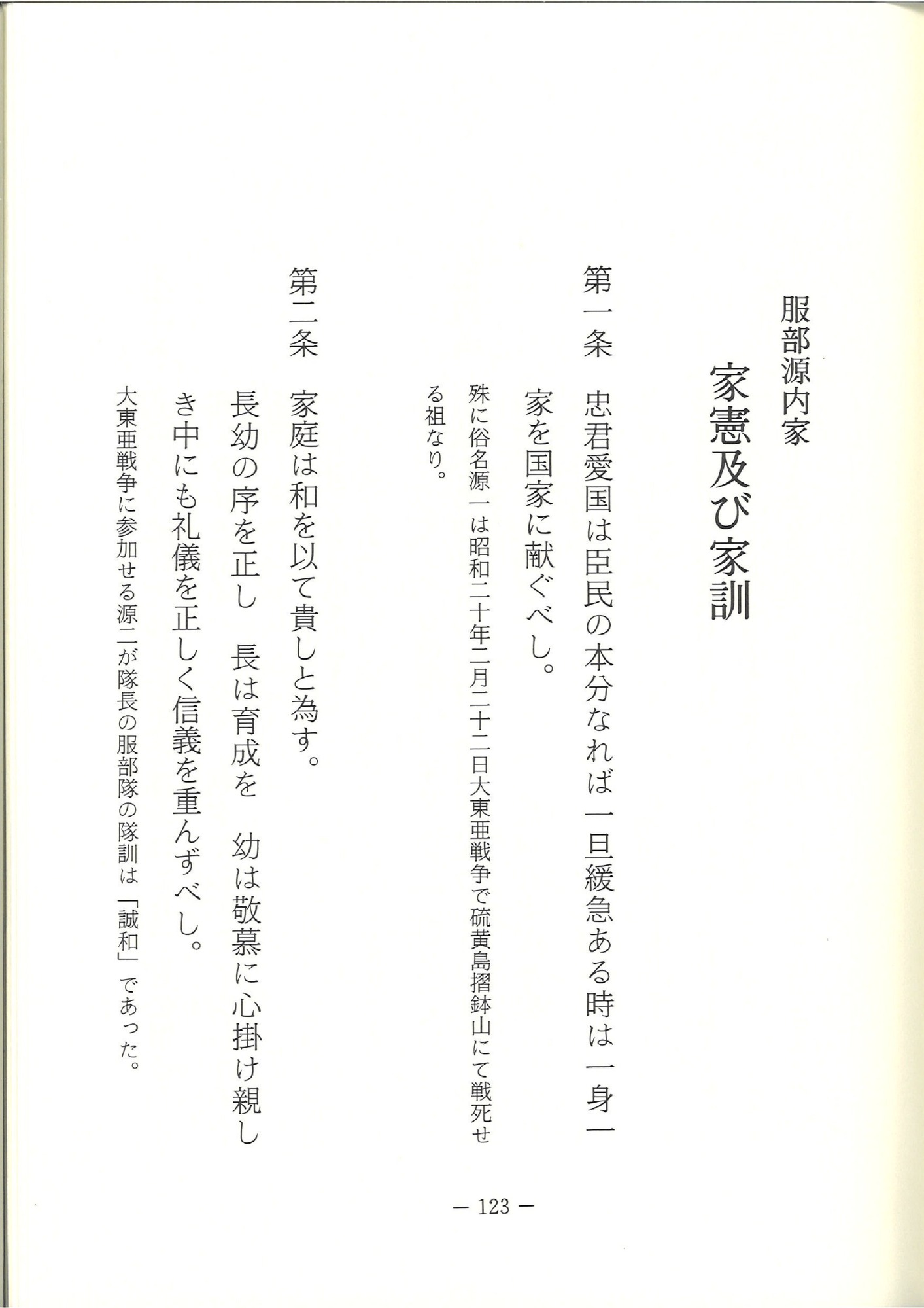 悠久ノ大義ニ生クル我アルヲ思ヒ常ニ家憲(かけん)ニ遵(したが)ヒ斎家(さいか)スベシ」