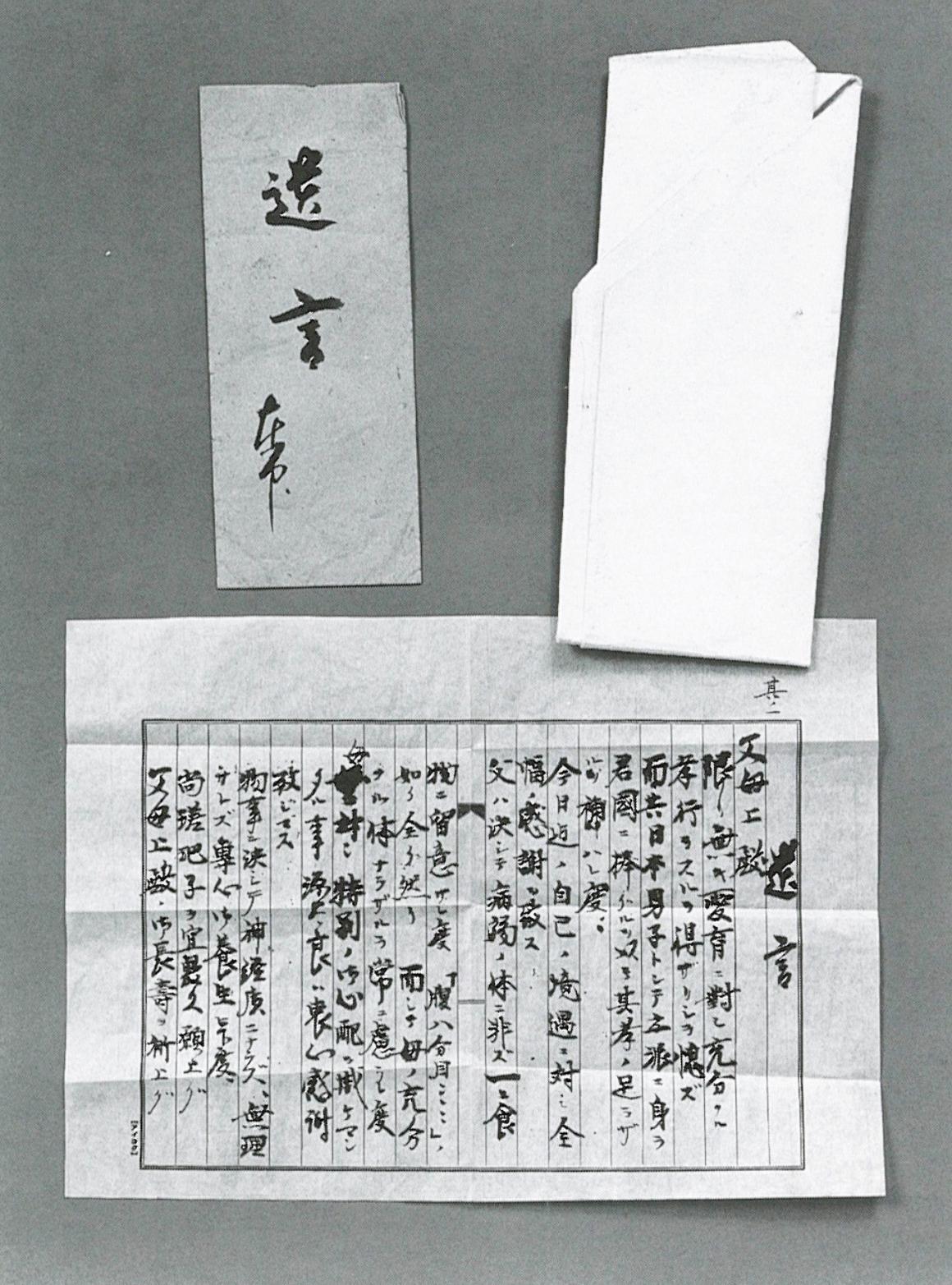 原稿用紙に墨で3枚。父母への感謝、妻と娘への励まし、弟には国への忠誠が説かれていた。そして、「服部家子孫へ」とあり、以下の文言が書かれていた。
