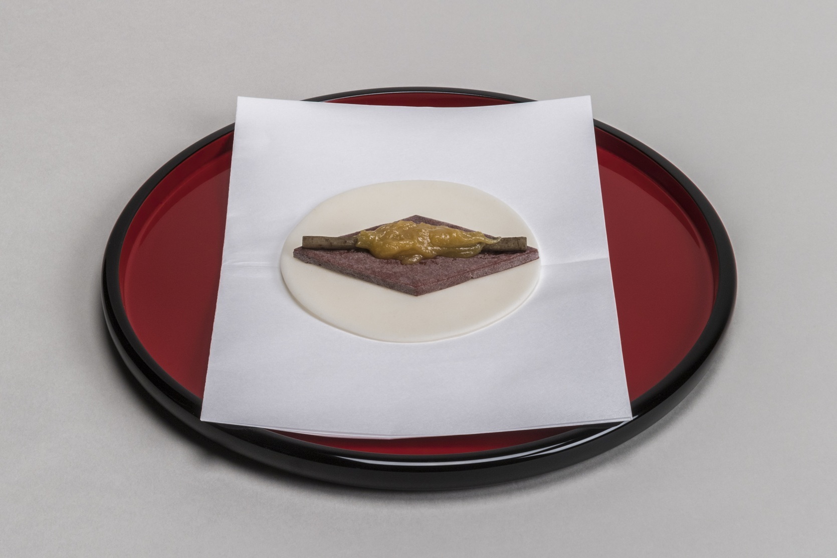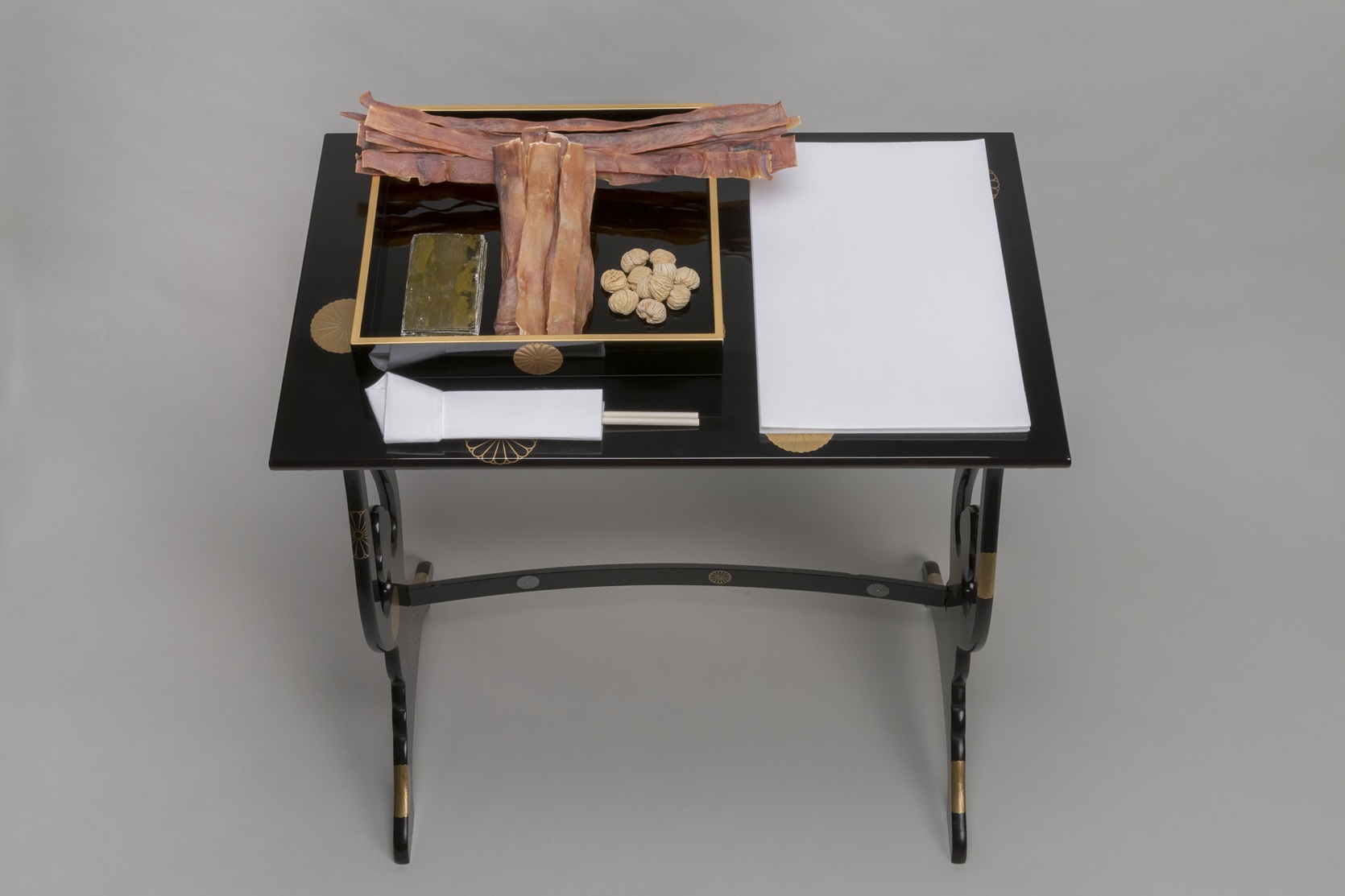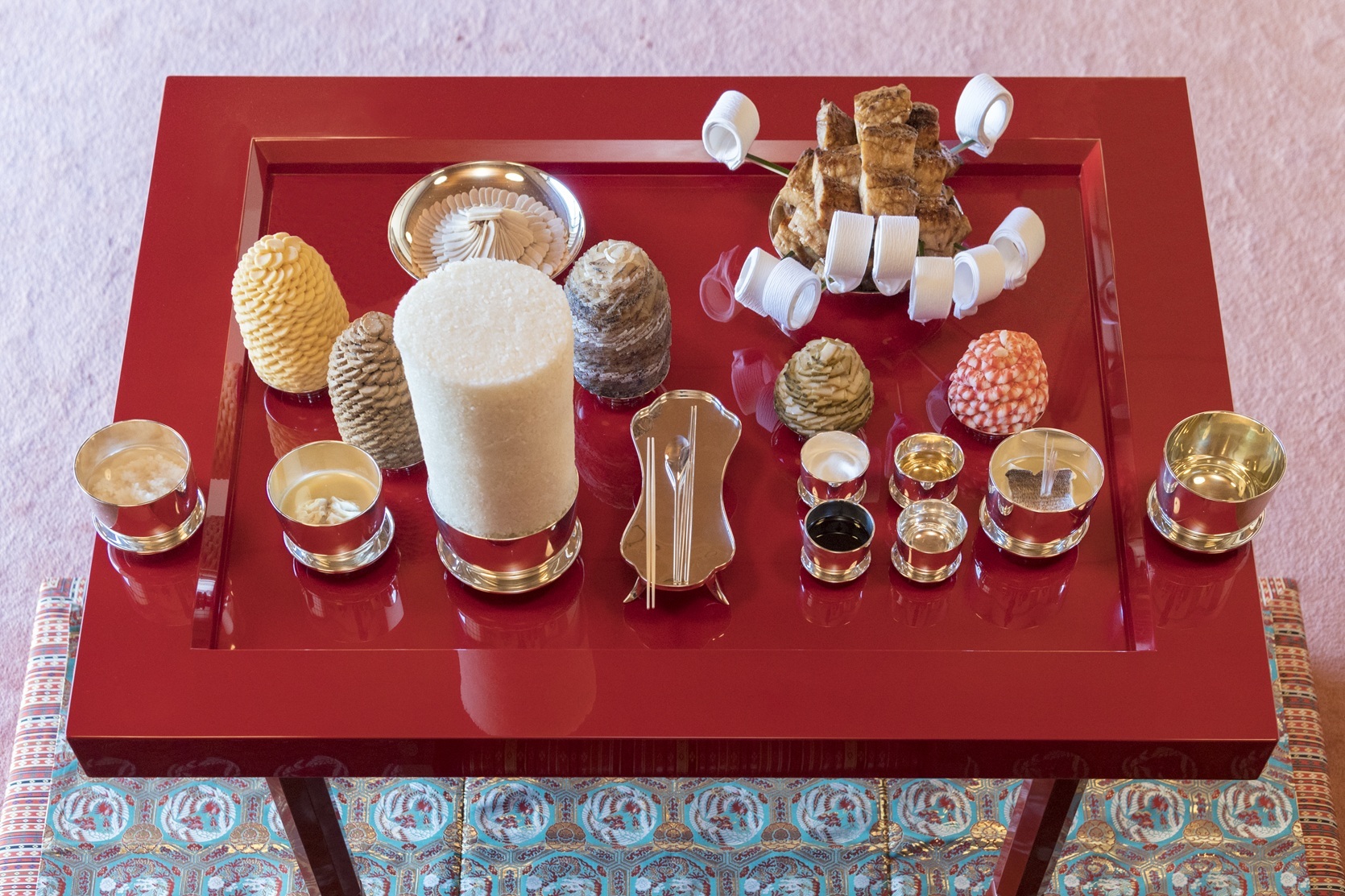 天皇陛下が元日に宮殿で最初に臨まれる行事が「晴御膳」です。「御毯代(ごたんだい)」と呼ばれる錦織の敷物の上に朱塗りの「御台盤(おだいばん)」をしつらえ、その上に伝統料理の品々が並べられます。これらのおめでたいお料理は、新年にあたり神様に捧げるためのもので、天皇陛下が実際に召し上がることはありません。