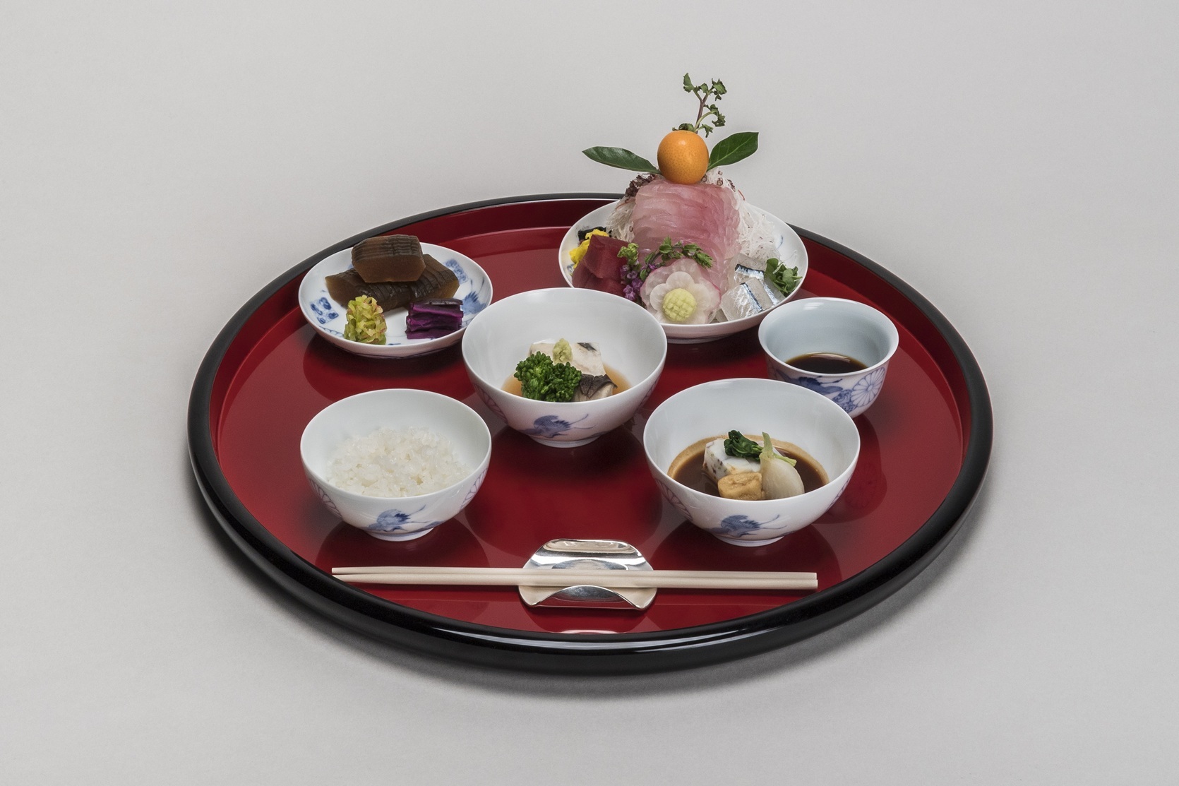 日本の伝統的なお祝いの御膳で、一汁三菜の本膳に二の膳がつく形式のもの。本膳は向かって左、二の膳は向かって右に、一緒に出されます。献立は日によって異なります。