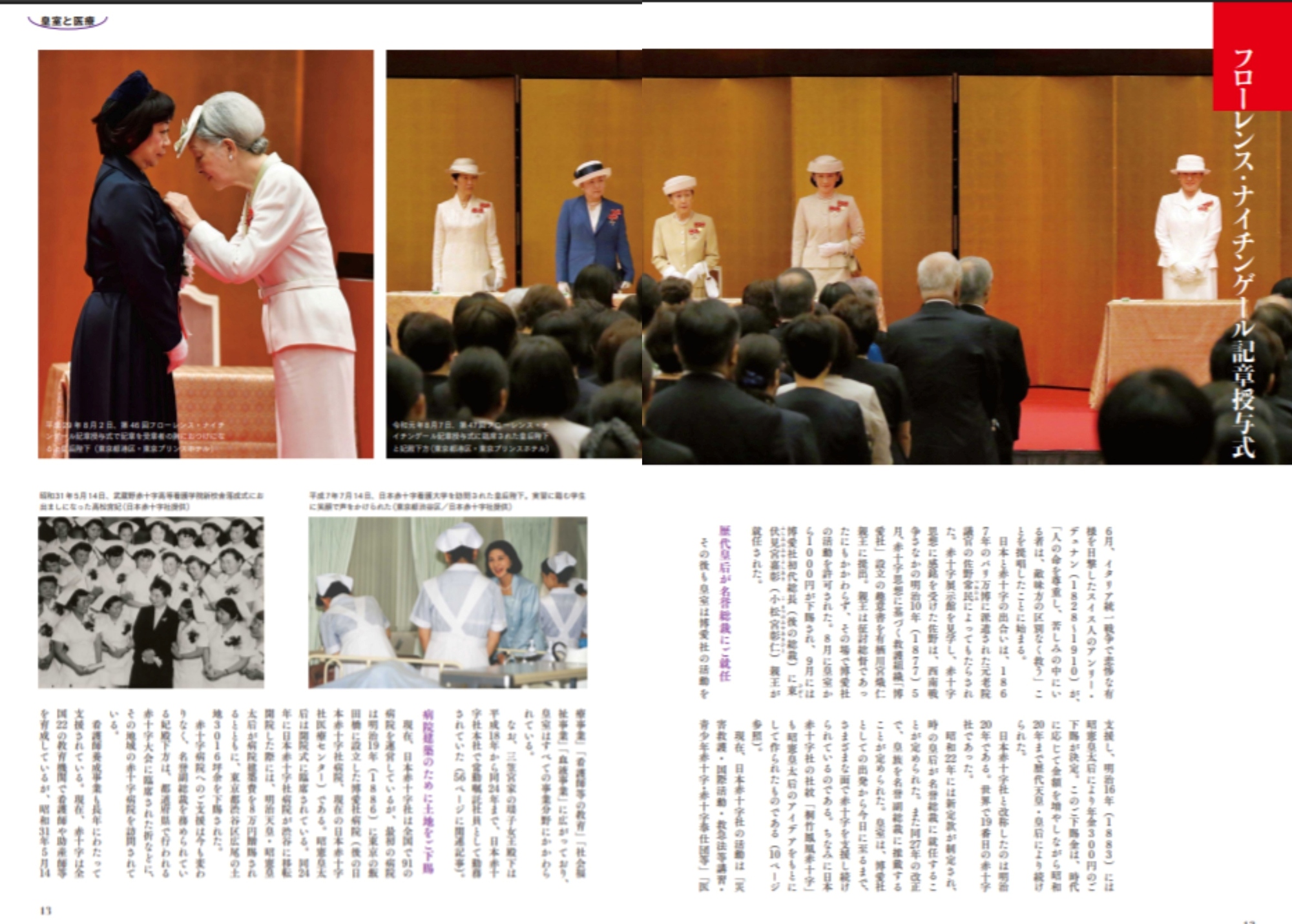 また、2年に1度、世界で看護活動に顕著な功労のある人を赤十字国際委員会が顕彰するフローレンス・ナイチンゲール記章授与式でも、皇后陛下が章記と記章を授与される。