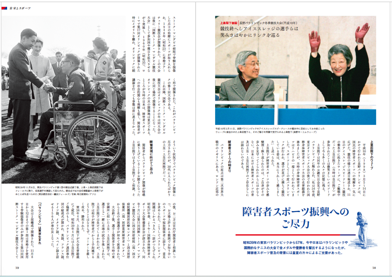 上皇・上皇后両陛下の思いを受け継ぎ、天皇陛下も障害者スポーツを応援してこられた。皇太子殿下時代には毎年の全国障害者スポーツ大会にご臨席。平成10年(1998)の長野パラリンピックでは名誉総裁を務められた。