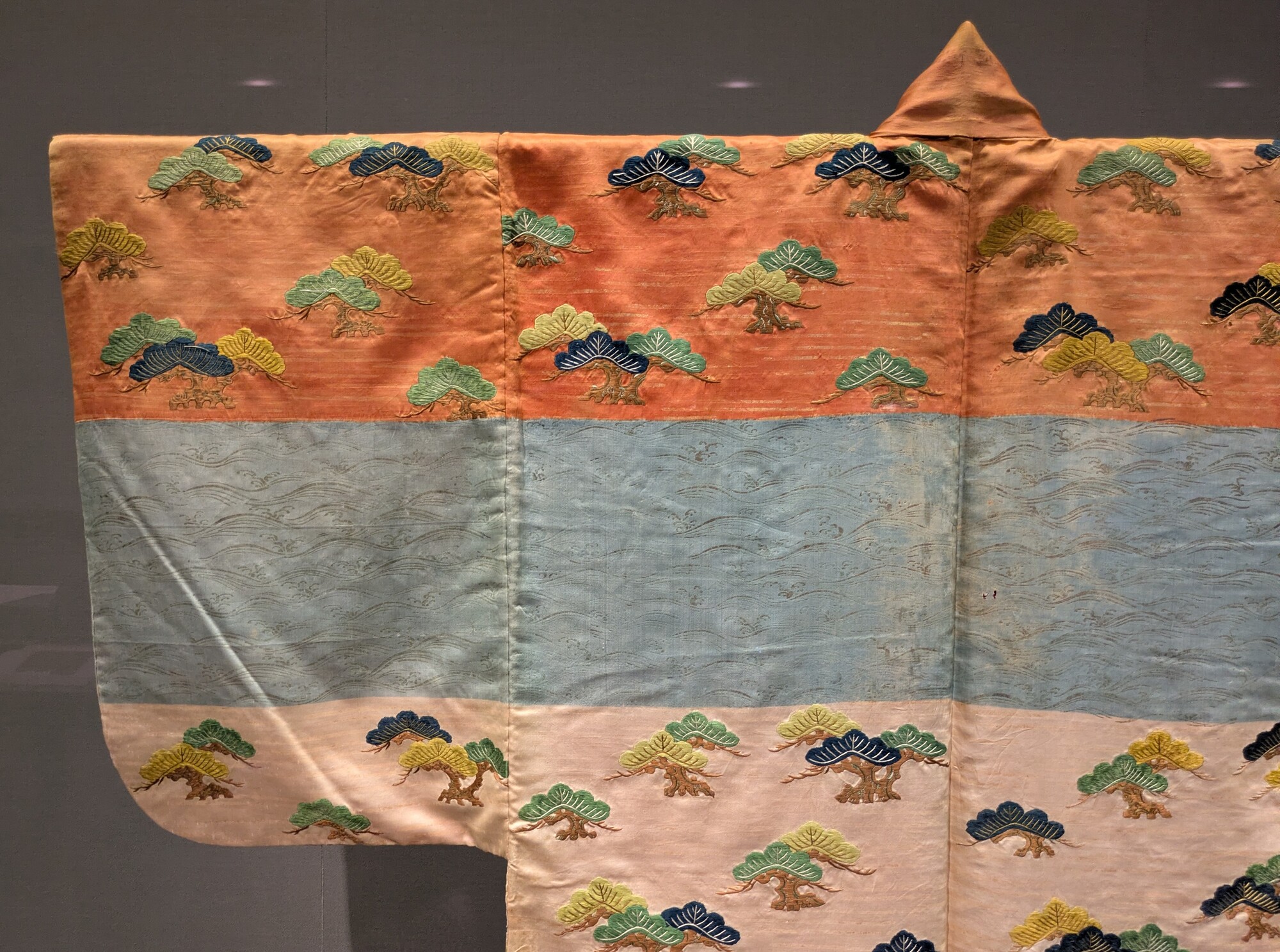 縫箔(ぬいはく)は、型紙を用いて金銀の箔を貼り付けて模様を表す摺箔(すりはく)と、刺繍の技法を併用した装束のこと。女性の役柄に用いる場合は、袖を通さず腰に巻き付けて着装しますが、男性の役柄の場合には着付として用いることも。こちらの縫箔の場合は、紅と白の地色のところには松の模様が刺繍で表され、その間の浅葱色(あさぎいろ)の地色のところには、ちょっと見づらいのですが、波の模様が銀の摺箔で表されています。三保松原(みほのまつばら)を舞台にした曲「羽衣」や、須磨の浦を舞台にした曲「松風」を想起させる装束です。