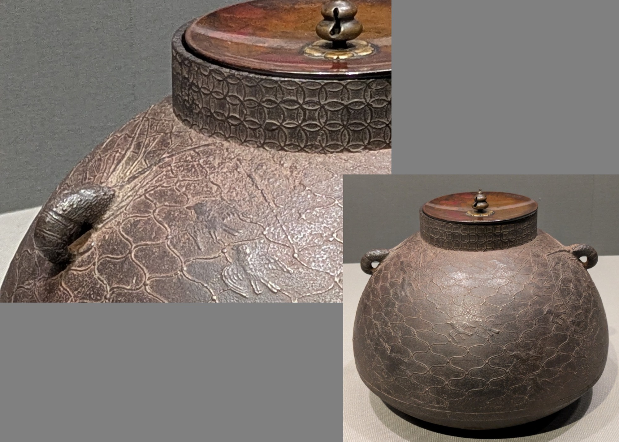 こちらの下膨れのぽってりした形の釜は、口に七宝模様、胴部に網目に千鳥の模様が施され、鐶付(かんつき)は海老、蓋の摘(つまみ)は瓢(ひさご)が象(かたど)られて、吉祥モチーフづくし。大正9年2月26日の茶会で用いられた、釜師・大西家の二代・浄清(じょうせい/1594-1682)の作とされる釜です。春寒の時候の茶会、こんな楽しさいっぱいの釜から湯気が立ちのぼるさまを想像すると、なんともいえない豊かな気持ちになります。