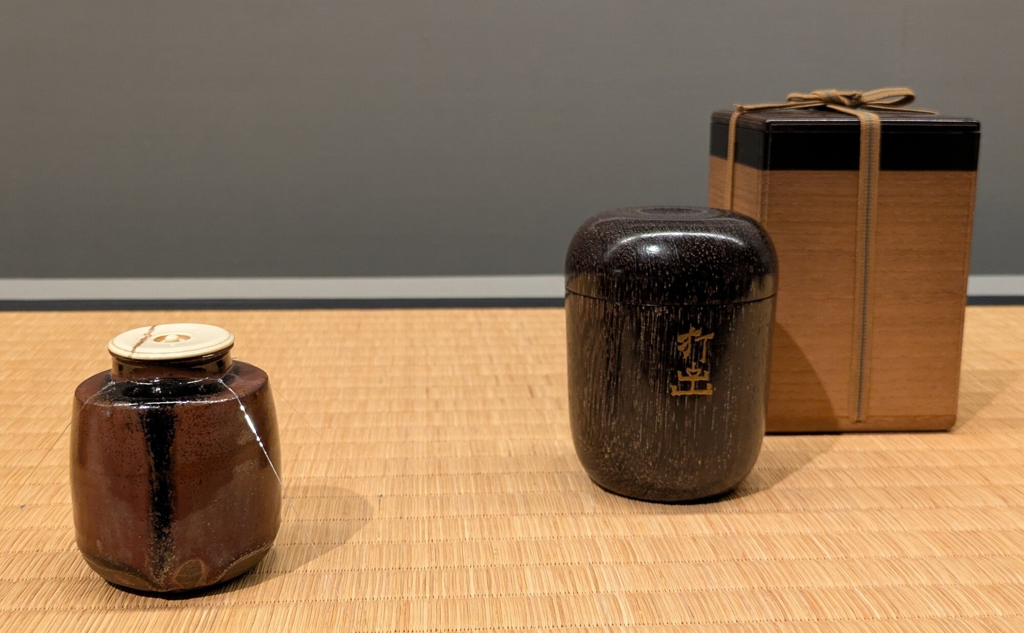 江戸時代初期の茶人・小堀遠州(1579-1647)伝来の茶入(ちゃいれ)は、大正7年10月28日の茶会で用いられたもの。肩の張った肩衝(かたつき)と呼ばれる形状で、一筋流れ落ちる黒釉(こくゆう)が見どころ。琵琶湖の南西・大津にあった浜に由来すると伝わる「打出(うちで)」の銘(めい)があります。茶入を収納する挽家(ひきや)に金粉で記された「打出」の文字は、遠州筆と伝わるもの。よく見ると「出」の字は上部がちょっと変わった形になっていて、筆者の美意識を感じさせます。