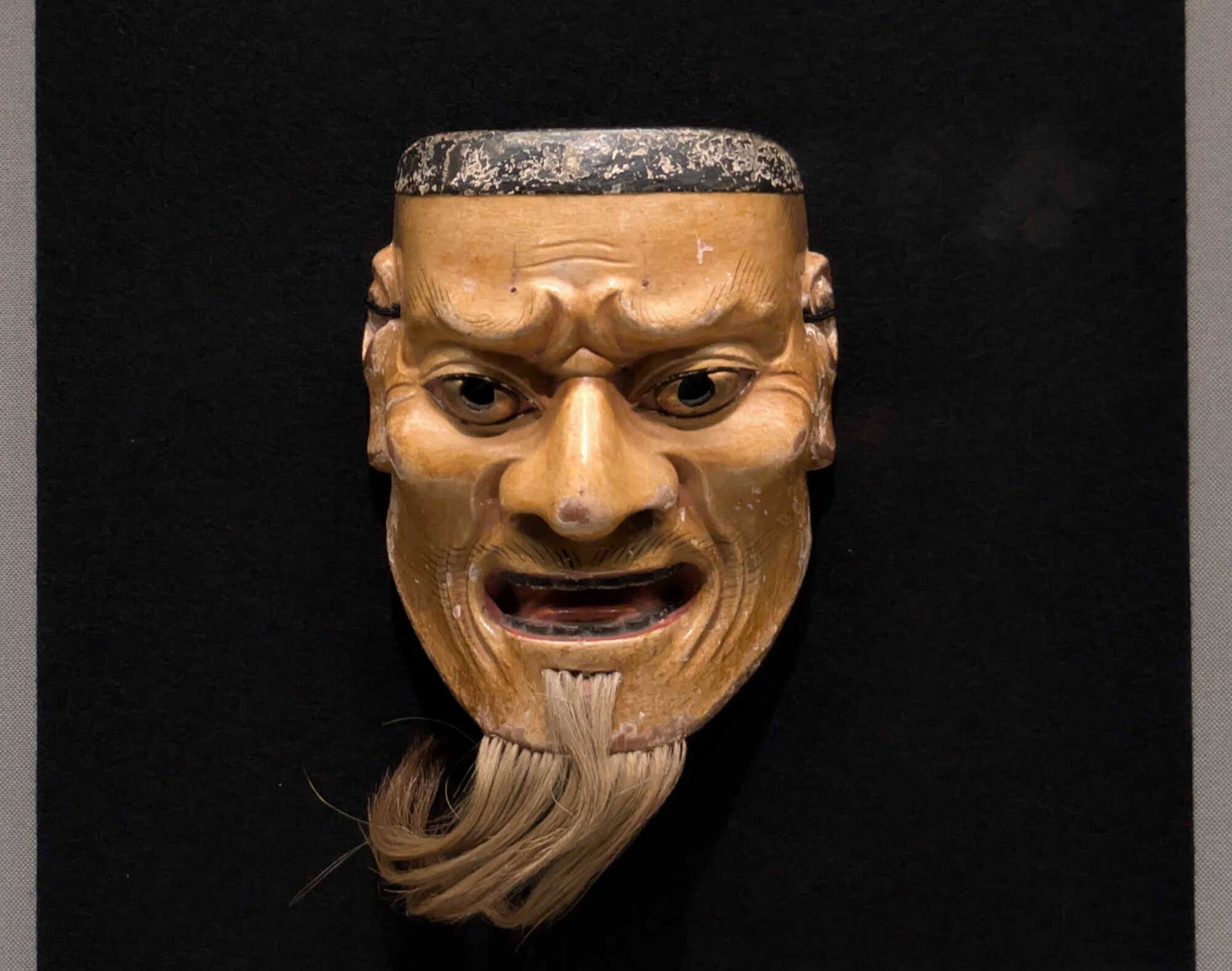 春翠は、能装束だけでなく、能面や笛、小鼓、大鼓、太鼓などの諸道具も収集しました。展示の能面には、翁(おきな)面や女面などのほか、見慣れない面(おもて)がありました。深く眉根を寄せてかっと双眸(そうぼう)を見開き、こちらを恫喝するような口元に、白い顎鬚(あごひげ)をたくわえた、異国人のような顔立ちです。強く恐ろしげな悪尉(あくじょう)と呼ばれる面の一種と思われるものの、類例のない珍しい面で、老体の超人的な役柄に用いられるものだそう。