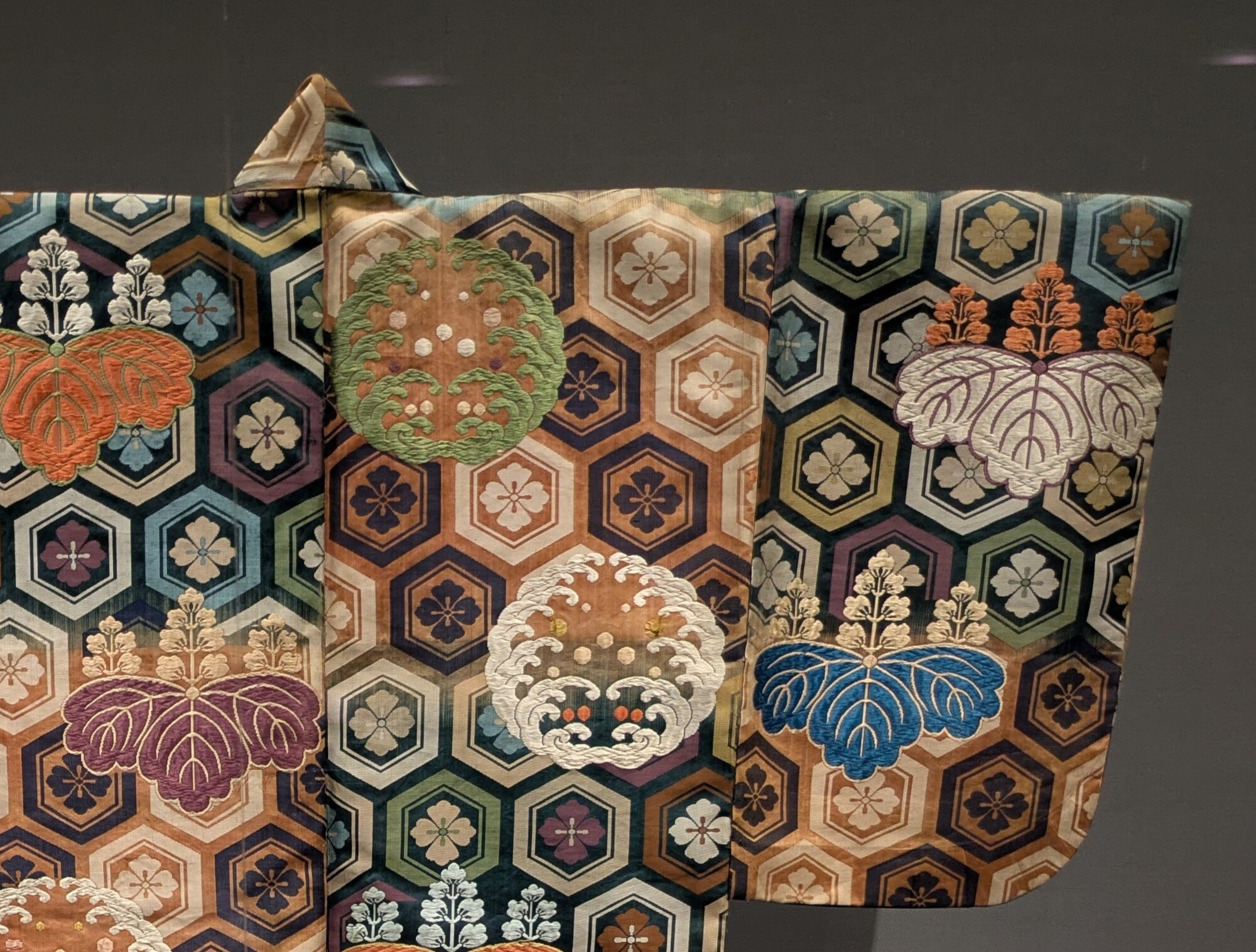 武将や神、鬼神など男性の役柄の装束に用いられる厚板(あついた)は、狩衣や法被(はっぴ)などの表着の下に着る着付(きつけ)の一種。もとは織物の種類を指す名称でしたが、能装束としての厚板には多様な織物が用いられています。表着を重ねるとほとんど見えないのですが、こちらも豪華。力強さのなかにも優美さのある意匠が表されていますね。
