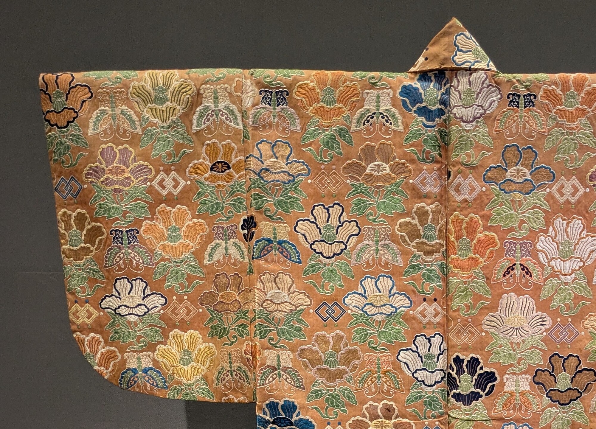 展示の能装束は、15代当主・住友春翠(しゅんすい/1864-1926)によって集められたもの。京都の公家・徳大寺公純(とくだいじきんいと)の五男として生まれ、能に親しんで育った春翠は、明治25年(1892)に住友家に入り、明治40年代より能道具類の収集を始めました。その多くは、春翠の能の師である観世流シテ方・大西亮太郎(1866-1931)の取り次ぎで購入されたもの。春翠による能装束コレクションの特徴は、演能に必要なさまざまな種類の装束が一通りそろっていること。たんなる鑑賞や装飾を目的とした収集ではなかったのです。