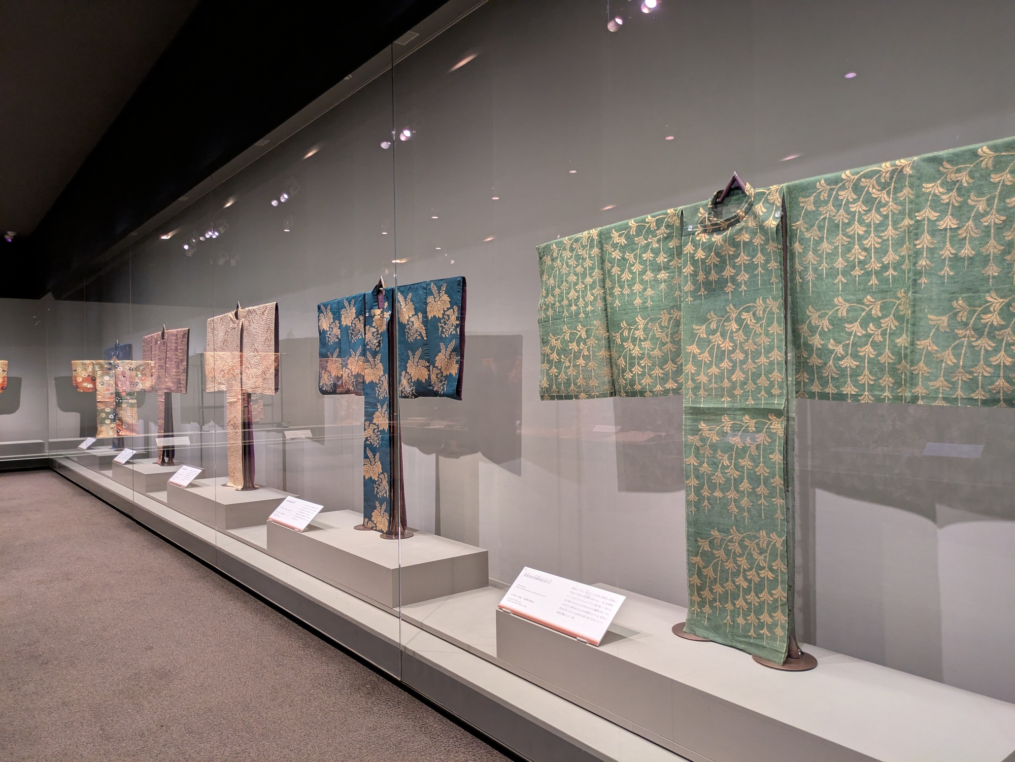 「謡い、舞い、演じるために―住友コレクションの能装束」と題した第Ⅰ章では、展示室の壁面ケース全体に能装束がずらり。100点を超える能装束コレクションを有する泉屋博古館東京ですが、まとまったかたちでの公開は、ほぼ20年ぶりのことだそう。