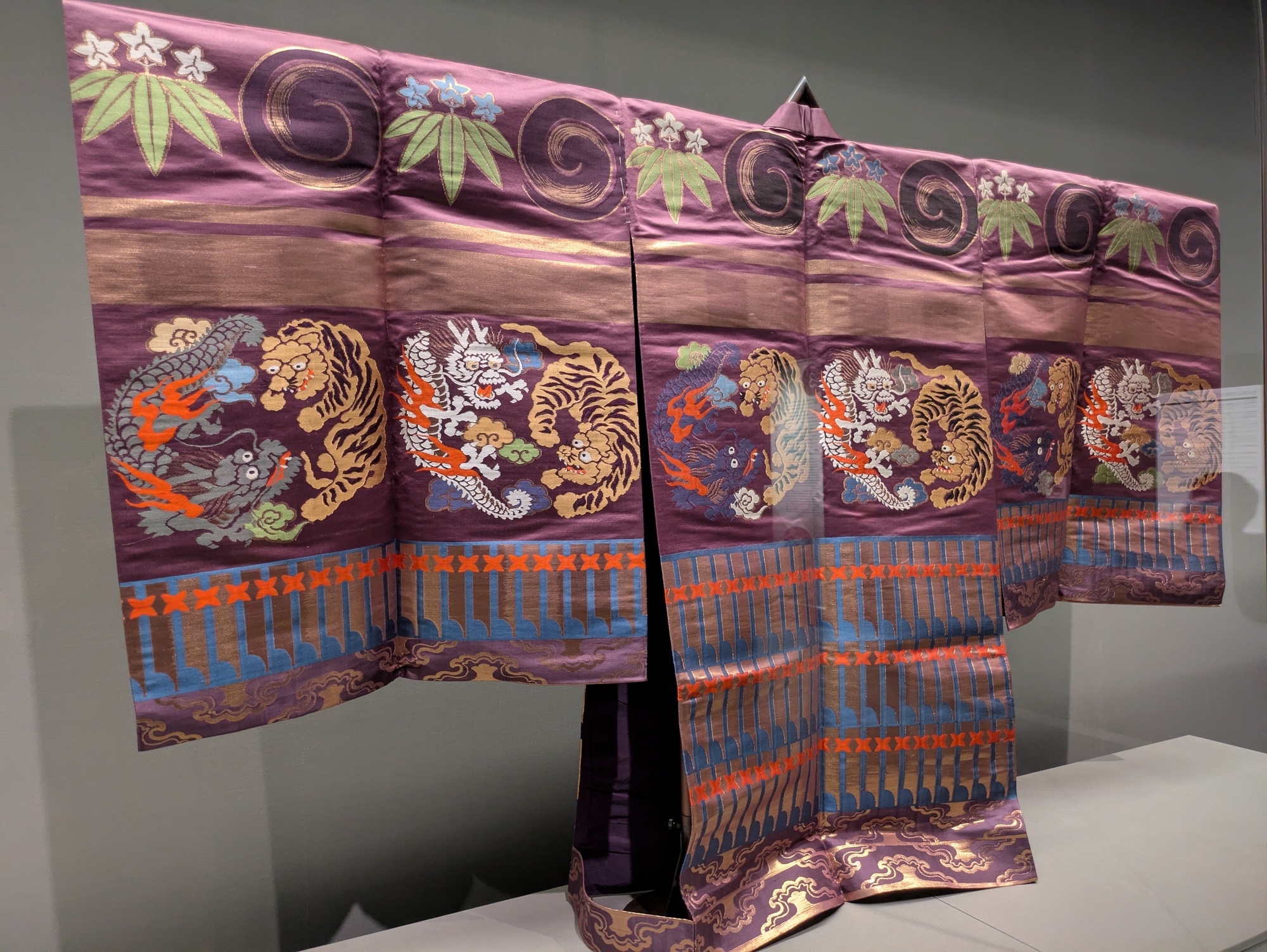 能装束のコレクションのなかには、買い取ったものだけでなく、春翠が新たにつくらせたものもあります。そのひとつが、向かい合う龍虎(りゅうこ)の模様が目を引く法被(はっぴ)で、大正10年(1921)に大西亮太郎を介して新調されたもの。法被といっても、お祭りで羽織る上っ張りではありません。能装束の法被は、鬼神(きじん)や武将、天狗(てんぐ)といった武張った役柄に用いられます。この法被には、龍虎のほか、笹竜胆(ささりんどう)や一つ巴(ともえ)、甲冑(かっちゅう)を構成する短冊状の小札(こざね)などの意匠が段ごとに配され、いかにも勇壮なイメージです。