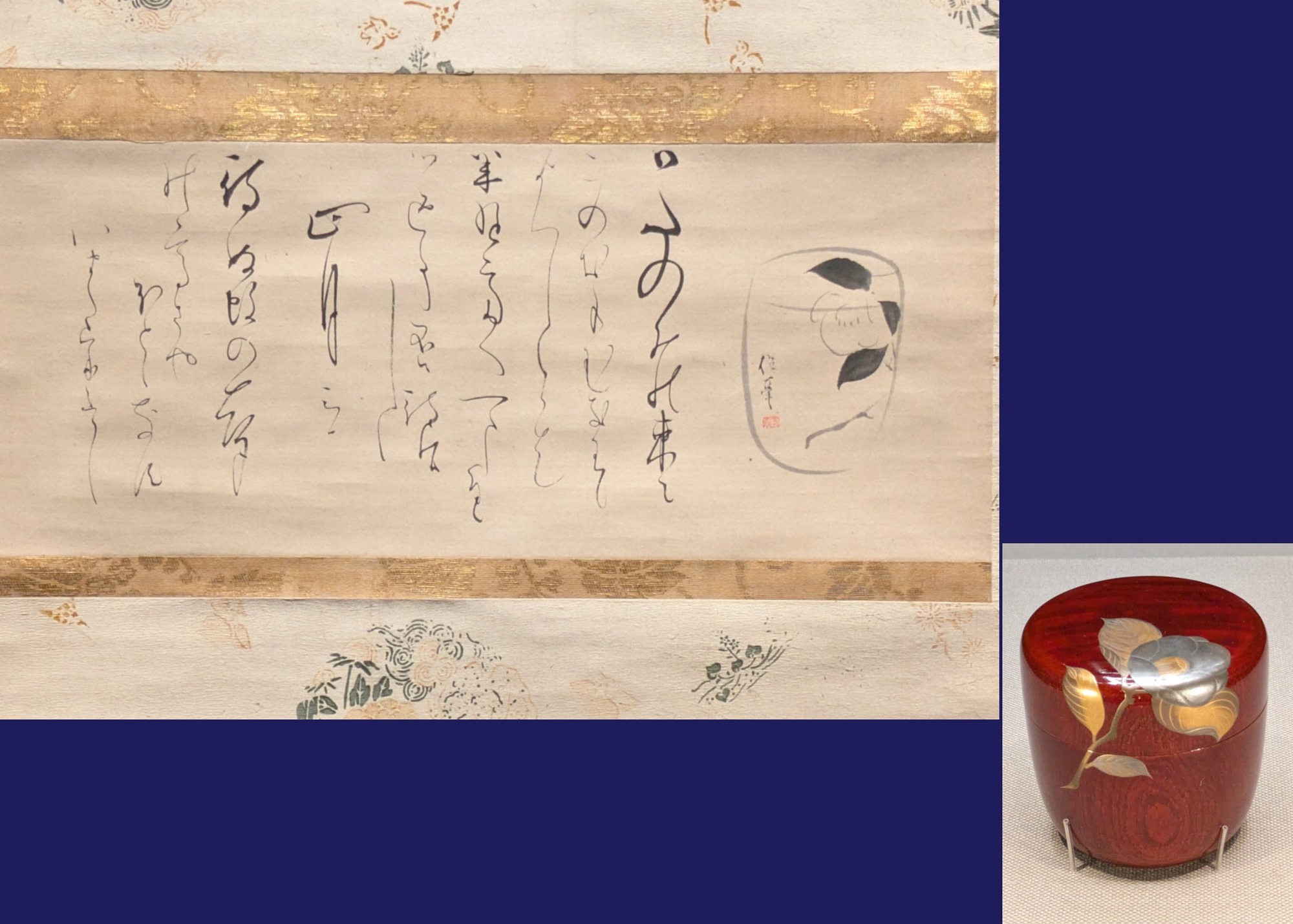 大正8年2月27日の茶会で、客が席入りの前に待機する寄付(よりつき)に掛けられた軸は、薄茶(うすちゃ)を入れる棗(なつめ)の絵が描かれた書状。これは、江戸琳派の絵師・酒井抱一(さかいほういつ/1761-1829)が、棗の下絵の依頼主に宛てて、このような趣(おもむき)ではどうかと絵に描いて送ったもの。そして、茶会の薄茶席では、この下絵をもとにつくられた棗が用いられました。高名な絵師が手がけた道具というだけでなく、その道具がつくられた背景が垣間見えるこんな仕掛けは、さぞかし客人を喜ばせたことでしょう。