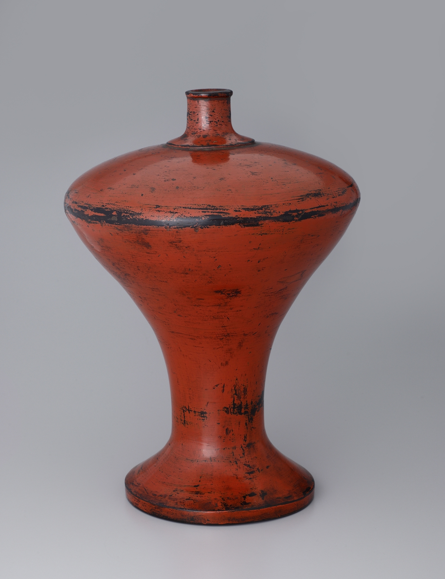 まず目に飛び込んでくるのは、本展のポスターにも採用された東京・サントリー美術館所蔵の瓶子(へいし)です。高さ32.5センチとかなりの大きさがあります。頂上に位置する筒状の小さい注口(そそぎぐち)から緩やかな局面を描いて張り出した両肩、そこからいったん細くなり、裾に向かって再び末広がりとなる姿は、優美でありながらも堂々としています。そして上に塗られた朱漆と、その下からのぞく黒漆との絶妙なコントラストが見事です。