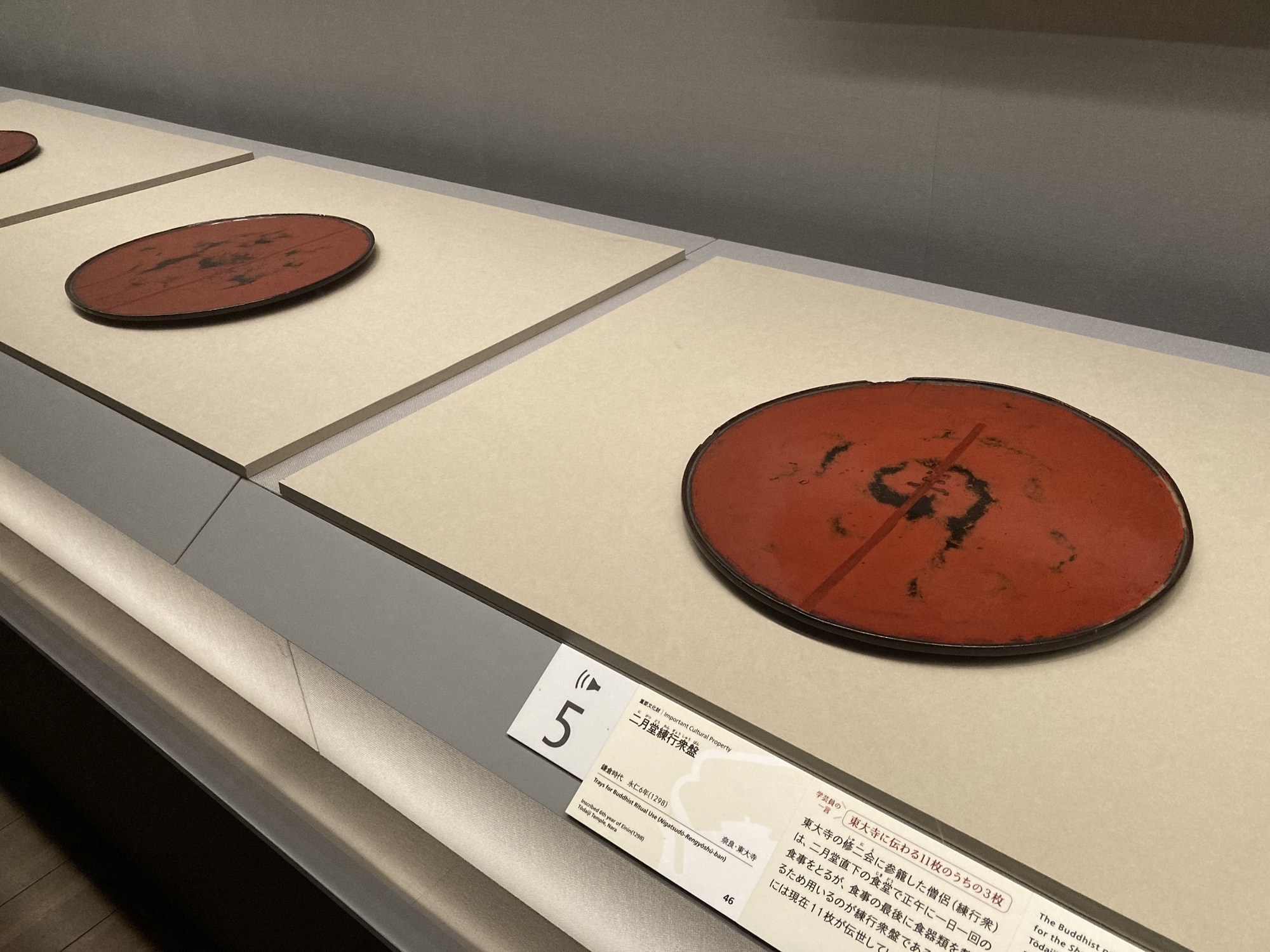 これらの6枚の盤は、底裏の銘から永仁6年(1298)の制作であることがわかっています。表面の中央には漢数字が描かれ、数字を取り囲むように広がる赤と黒の「景色」はすべて異なっています。修二会は天平勝宝4年(752)に始まって以来、今に至るまで一度も途絶えたことがなく、来年の令和8年(2026)に1275回を数えます。盤に見入っていると、「景色」の先に一心に祈りを捧げる練行衆の姿が浮かぶようでした。